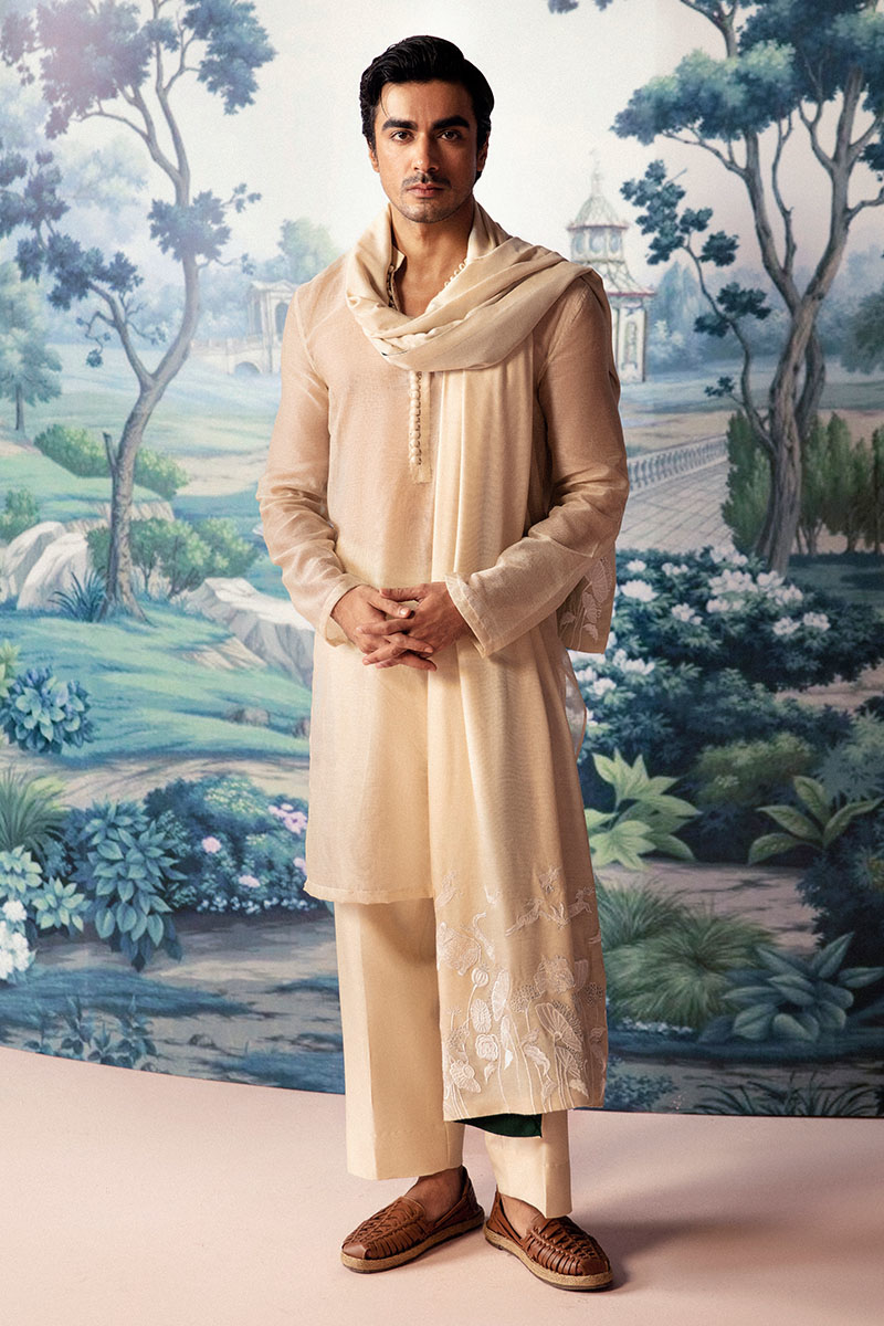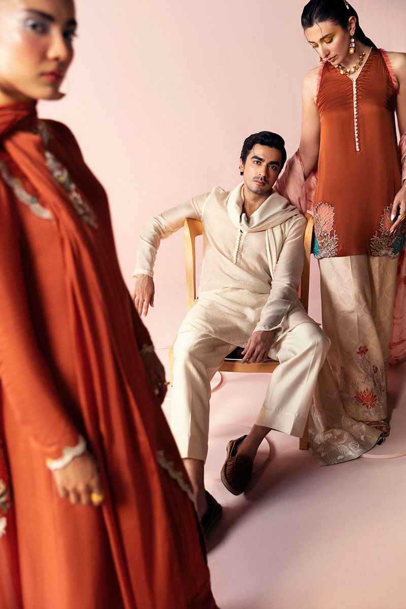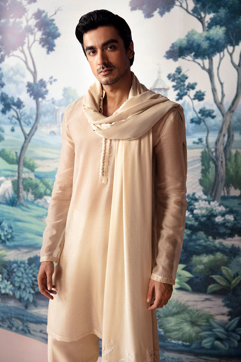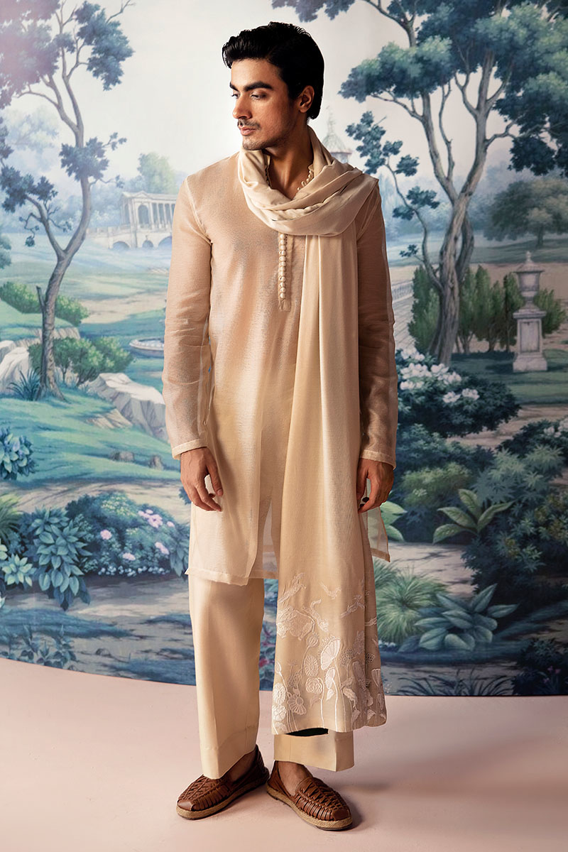 A Tale of Time" features a sophisticated silhouette with intricate loop button details. Paired with relaxed-fit trousers, this ensemble is completed by an exquisitely machine-embroidered shawl, enhanced with contrasting lining for a touch of opulence. Perfect for making a statement on any occasion.