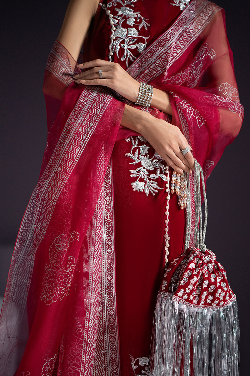 Embrace the epitome of elegance with 'Florid', featuring a red embroidered velvet shirt that exudes refinement. The ensemble is elevated with a printed organza dupatta and an embellished bag, creating a harmonious blend of style and grace.