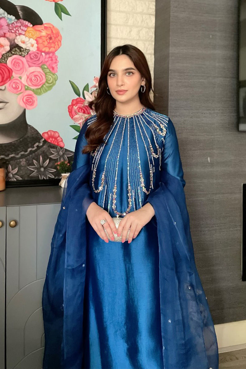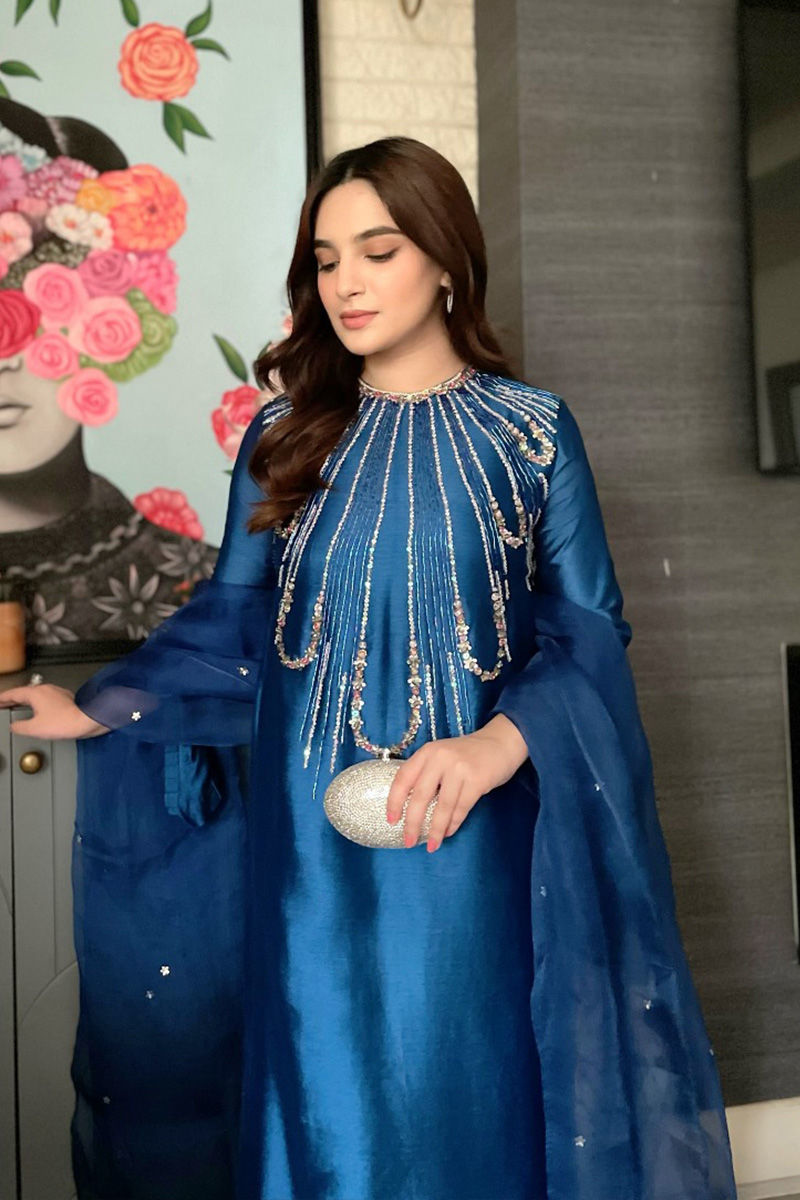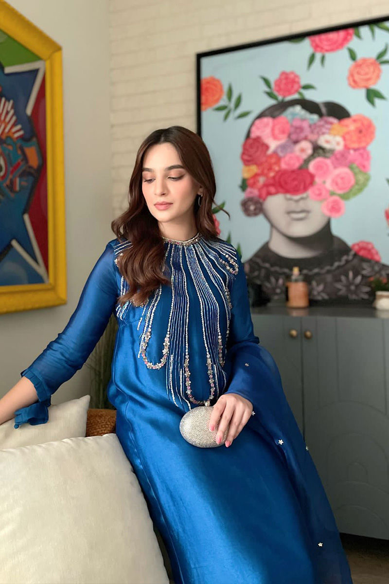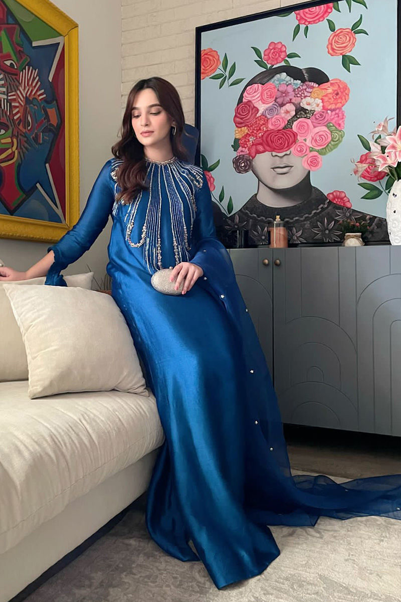 Long Tissue Silk kaftan shirt in royal cobalt blue with finely hand embellished neckline design. Sleeves are fitted with key hole detail and pleated frill stitched. It has short side slits and looks ethereal.