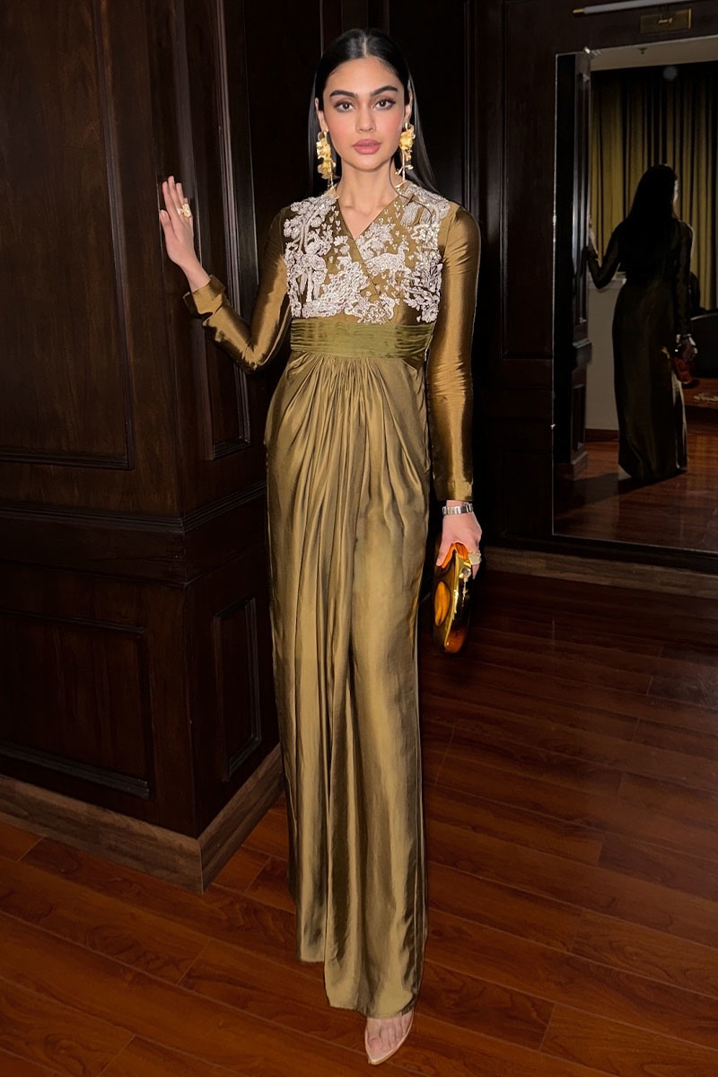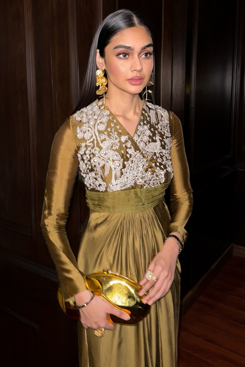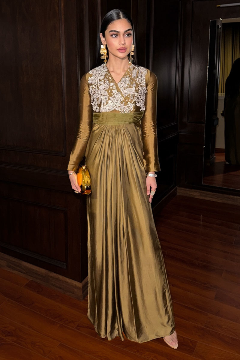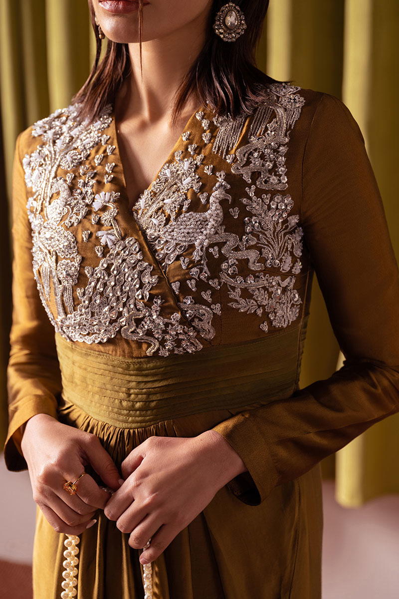 Experience the epitome of glamour with "Mademoiselle". Enveloped in the subtle allure of Dull Mustard, this ensemble, crafted from luxurious Tissue Silk and Silk, is a testament to refined sophistication. With its exquisitely embellished bodice, complemented by a pleated organza belt and a gracefully draped lower part, every detail exudes opulence. Paired with an ethereal Organza sequins spray dupatta and an embellished Bag, revel in the essence of festive charm and timeless beauty.