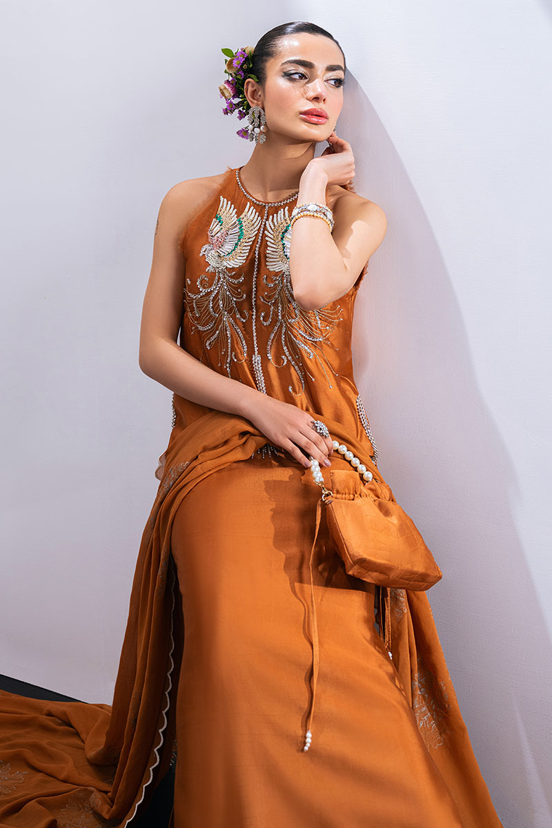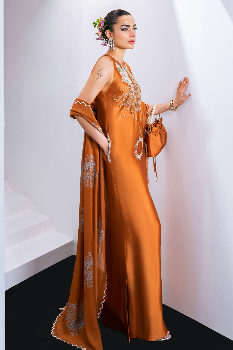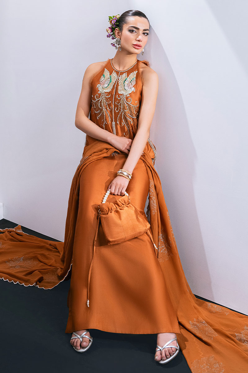 Fabric: Shirt: Tissue Silk Color: Rust Work Details: Embroidered and Embellished