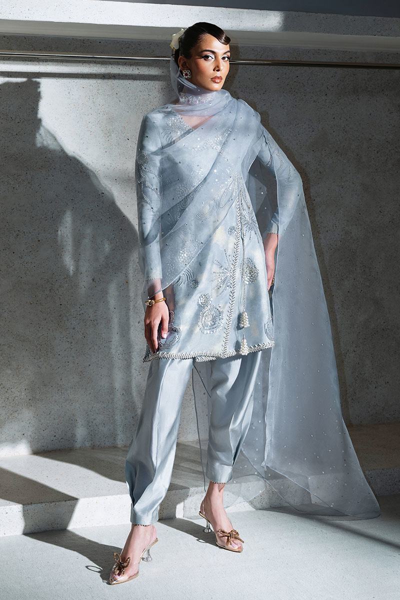 Blooming — where tradition meets modern elegance. This mid-thigh Angrakha-style shirt with side slits is paired with a classic shalwar and a flowing organza dupatta. The neckline and front panel are intricately embellished with crystals, pearls, beads, and delicate sequin work, complemented by tie-dye lining and detailed tassel accents. The sleeves are adorned with meticulous embellishment, finished with a charming bow detail and samosa lace. The shalwar features tuck pleats and samosa lace at the hem for added finesse, while the dupatta completes the look with a shimmering, heavy sequin spray.