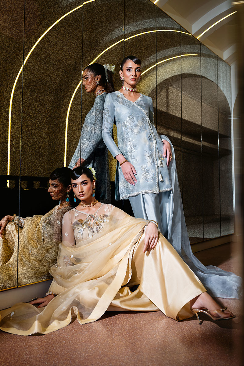 Includes: Shirt with Shalwar Bloomingdale - A soft beige ensemble featuring a mid-thigh organza shirt adorned with hand-embellished birds, dabka, naqshi, crystals, and sequins. Finished with a keyhole neckline and tassels, paired with a farshi shalwar in tissue silk and an organza dupatta detailed with lace and borders. Timeless elegance, redefined.
