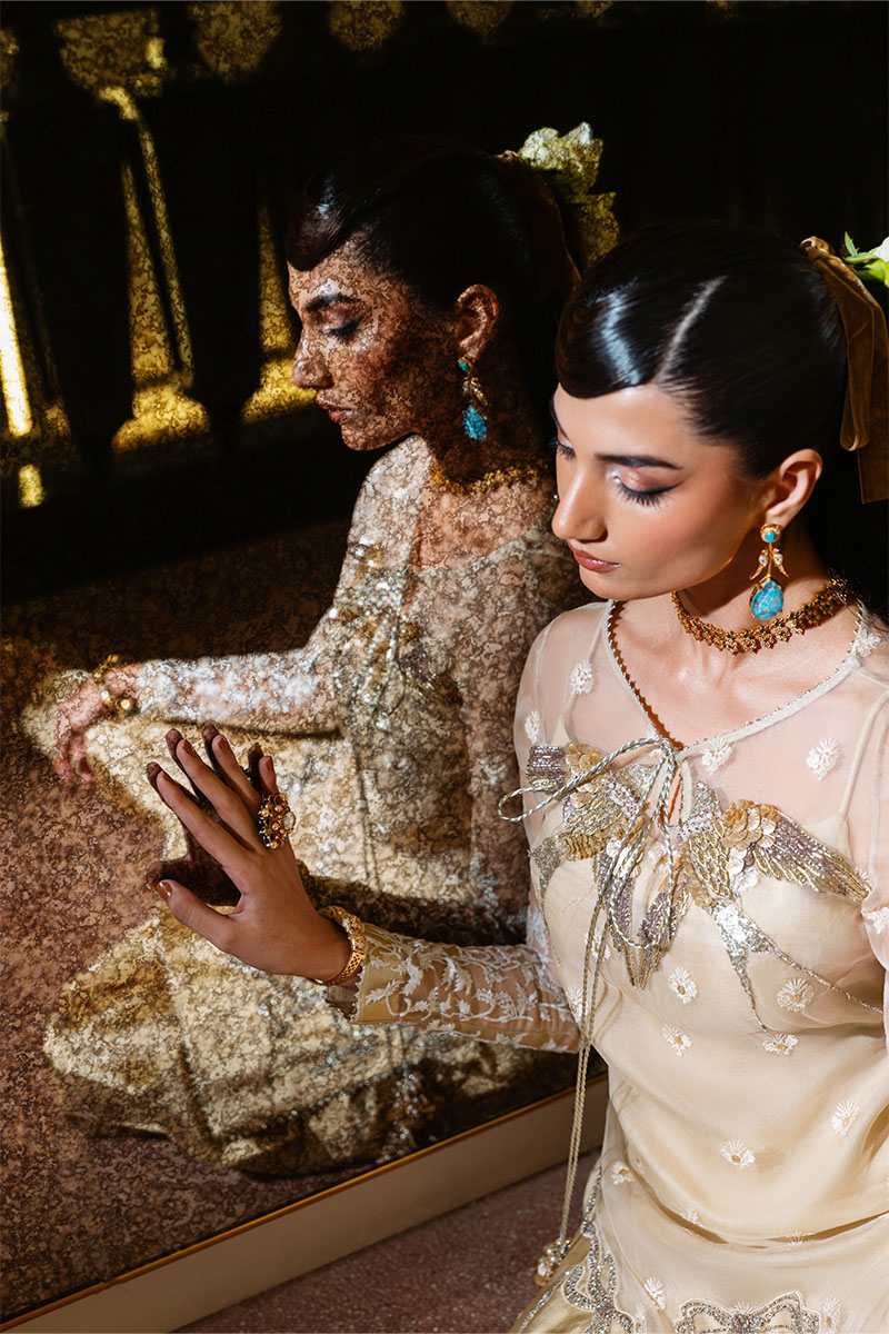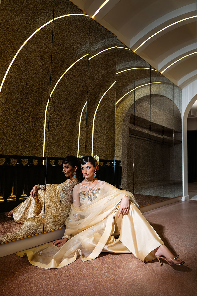 Includes: Shirt with Shalwar Bloomingdale - A soft beige ensemble featuring a mid-thigh organza shirt adorned with hand-embellished birds, dabka, naqshi, crystals, and sequins. Finished with a keyhole neckline and tassels, paired with a farshi shalwar in tissue silk and an organza dupatta detailed with lace and borders. Timeless elegance, redefined.