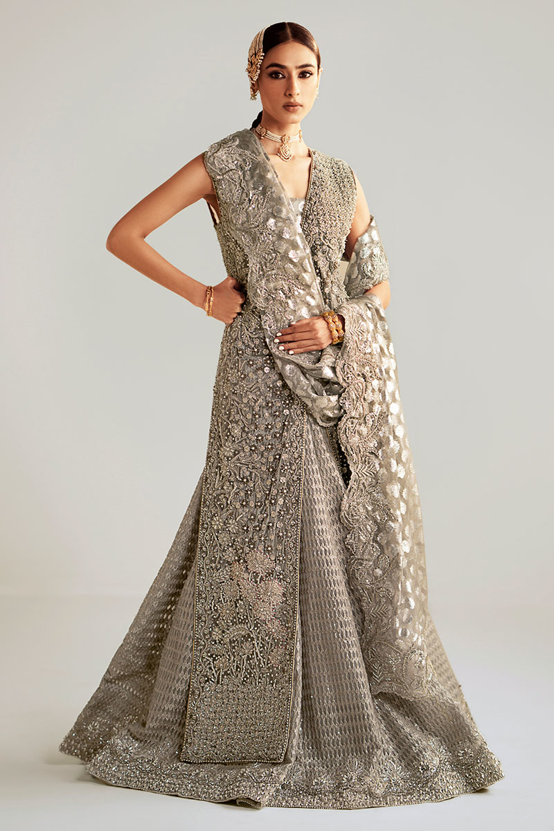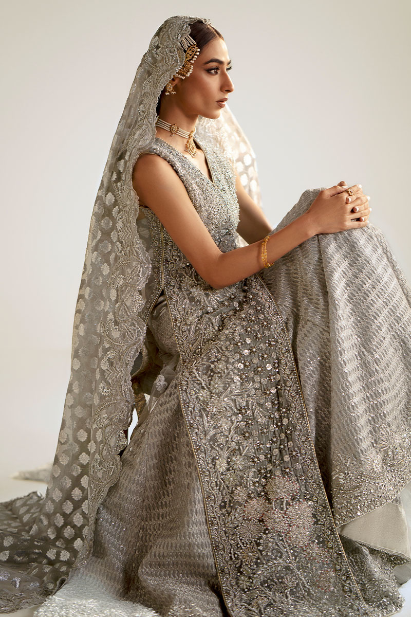 Unveiling "Chaandi," a voyage through the world of bridal opulence. In a mesmerizing silver-gray hue, this bridal outfit combines a heavily embellished long front open shirt, fusing velvet and net with traditional handwork techniques. The rich textures of velvet and net in the shirt exude regal charm, while the textured organza lehnga features an intricate hand-embellished border. Completing the look is a zari organza dupatta with four-sided handwork. "Chaandi" is more than attire; it's a heartfelt connection to the dreams, anticipation, and joy of a bride's special day, encapsulating timeless beauty and unforgettable memories.