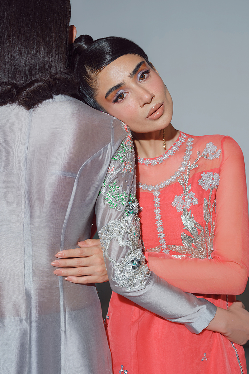 Fabric: Organza, Thai Silk Color: Coral Pink Work Details: Embroidered and Embellished