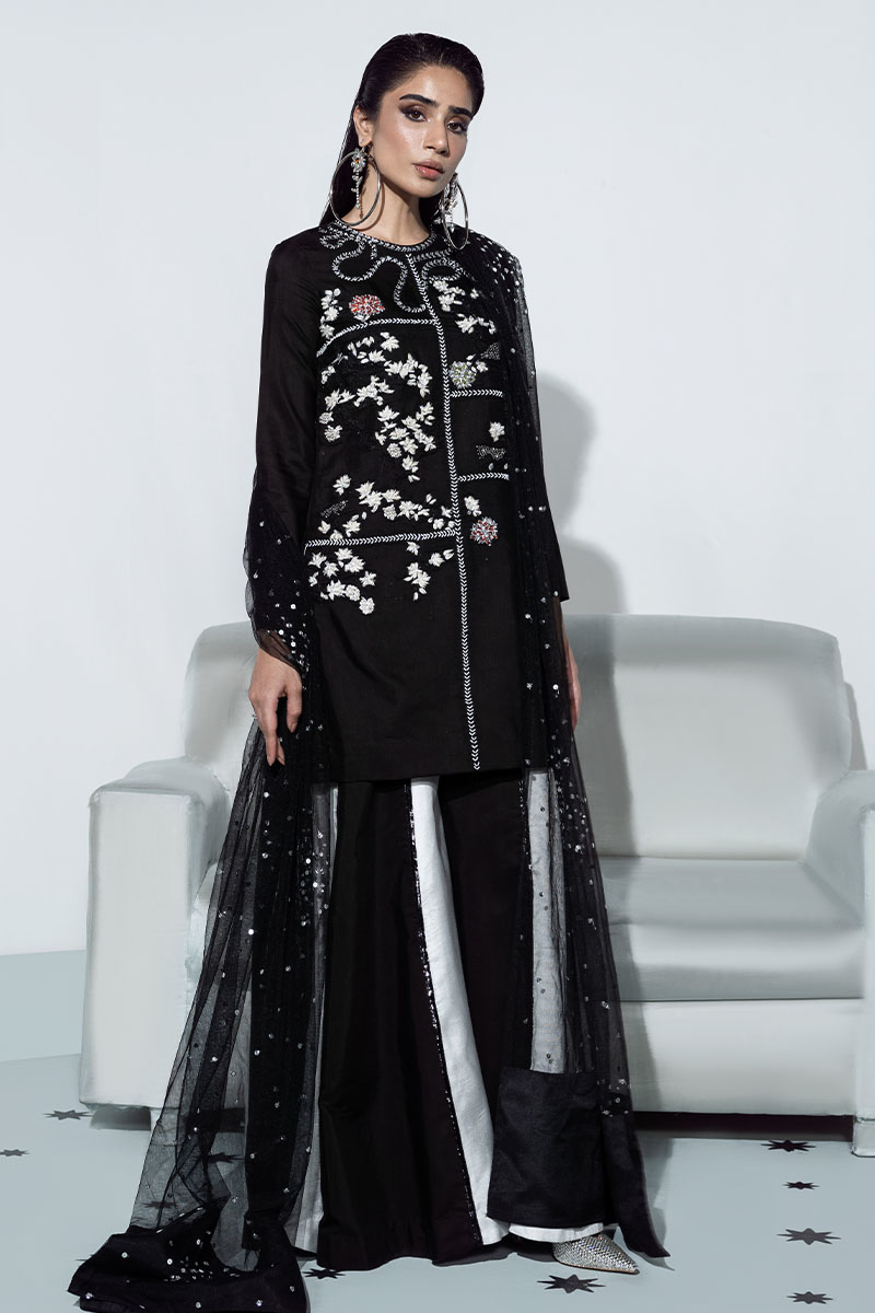Fabric: Thai Silk, Net Color: Black, White Work Details: Embroidered and Embellished