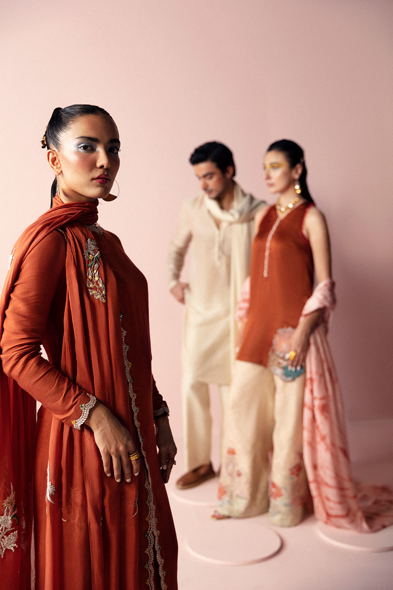 Revel in refined style with our "Fire Lily" ensemble in Rust. This V-neck halter shirt features frayed organza edging, contrast piping, and loop button details, perfectly paired with relaxed-fit trousers. The exquisitely patched and machine-embroidered floral motifs on the shirt edges, coupled with the intricate details on the embroidered trousers, make this outfit a standout choice for any occasion.