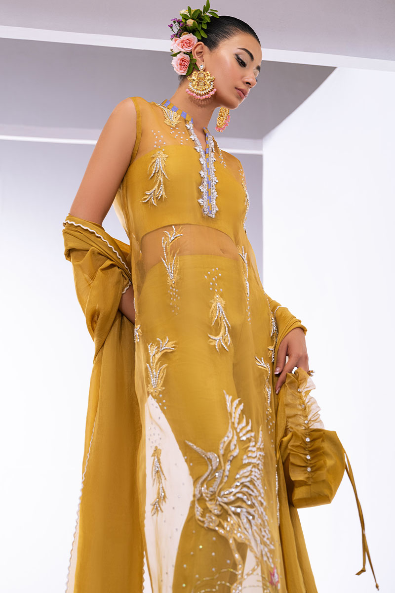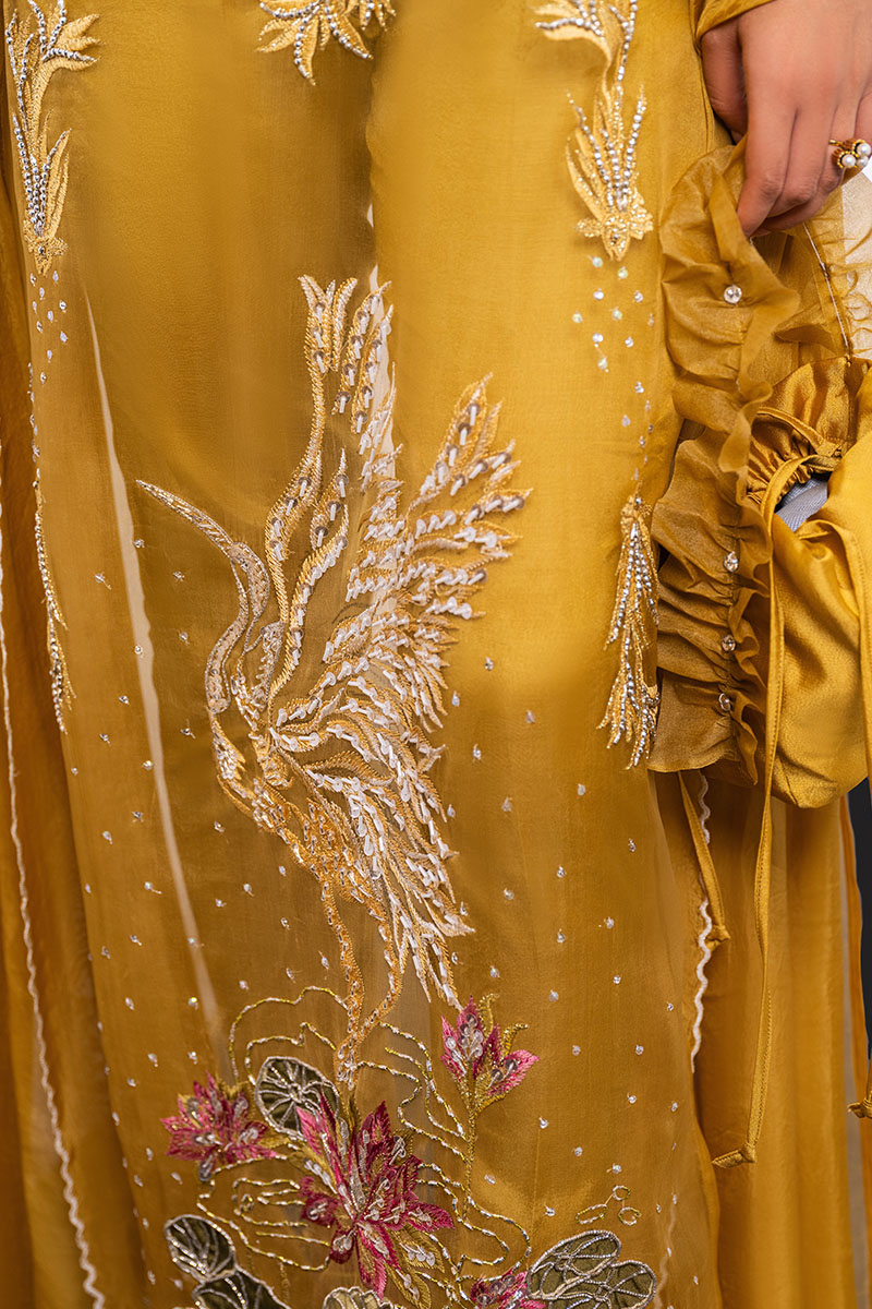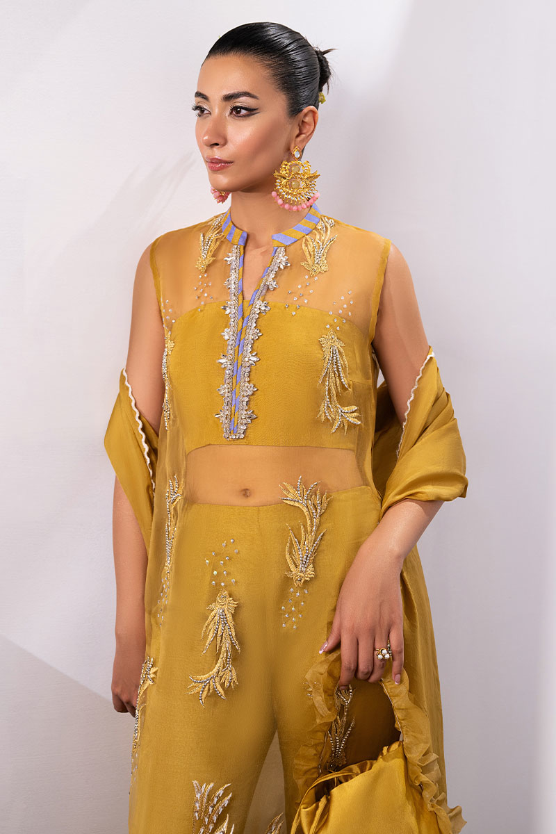 Fabric: Shirt: Organza, Trouser: Thai Silk Color: Mustard Work Details: Embroidered and Embellished