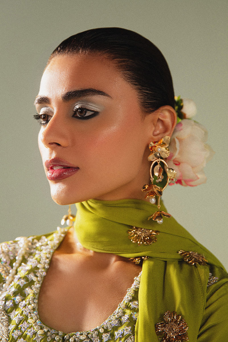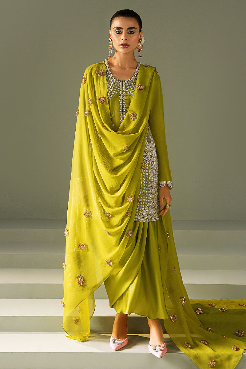 'GOOSEBERRY': A refreshing breeze of elegance in vibrant Apple Green color. Elevate your style with this stunning ensemble featuring a Mid-Length fully embellished raw silk shirt and a Heavily hand-embellished Kiran spray pure chiffon dupatta. Complete your look with a Silk draped skirt and Thai Silk bootcut trousers adorned with embellished edging on the hem, accompanied by an Embellished Bag.