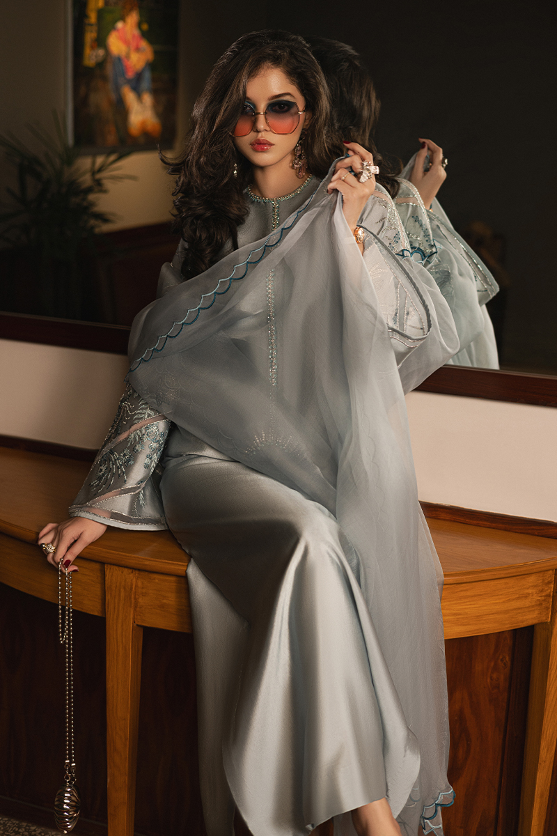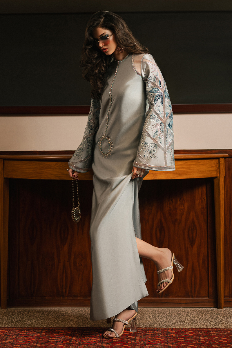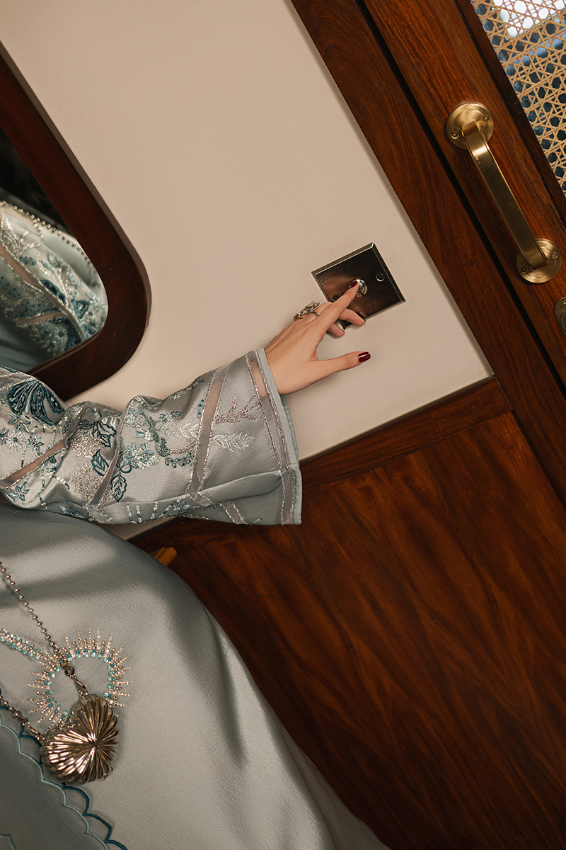 Iceberg, a stunning long kaftan dress featuring sleek side slits for a modern, flowing silhouette. The neckline, both front and back, is exquisitely hand-embellished and elevated with delicate organza patch detailing, exuding timeless refinement. The sleeves are a masterpiece of artistry, adorned with embroidered floral bunches seamlessly blended with velvet and organza patchwork. Completing the look is an organza dupatta, beautifully enhanced with a two-tone scalloped border that adds a touch of ethereal charm. Iceberg is where luxurious craftsmanship meets effortless allure, making it the perfect statement for any grand occasion.