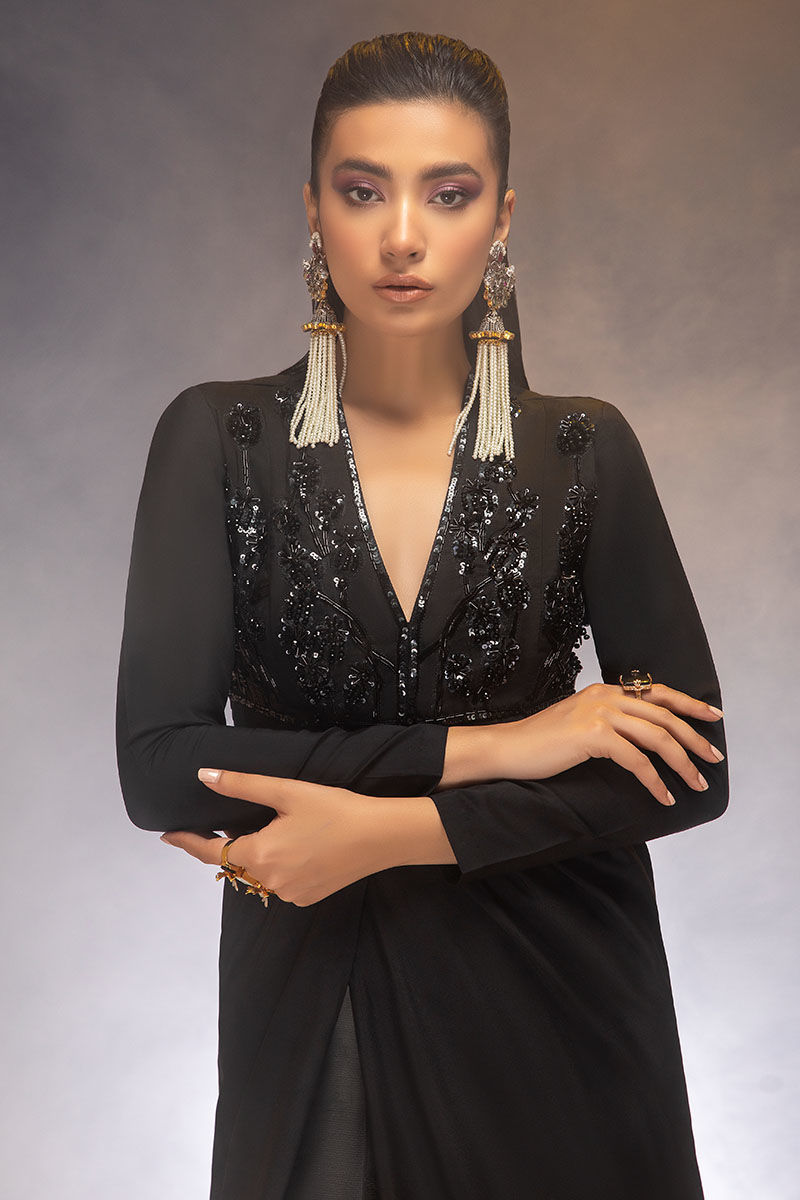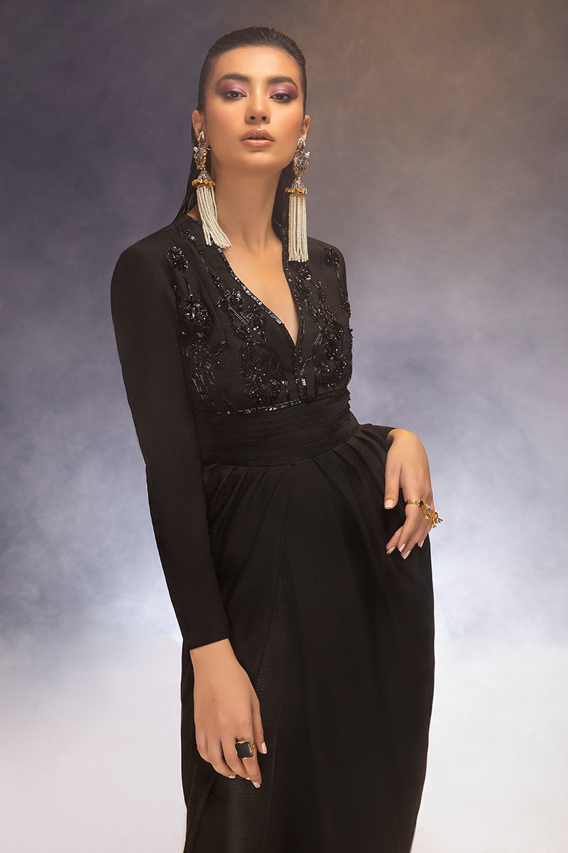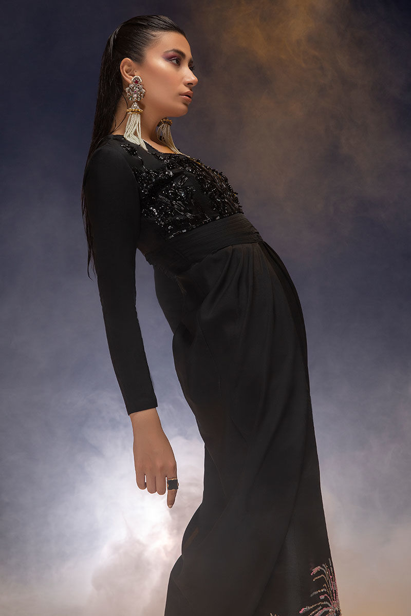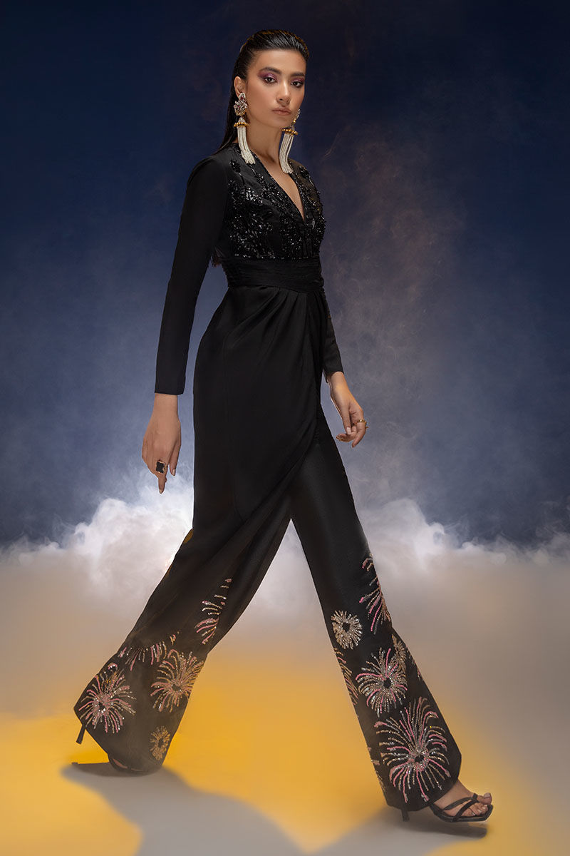 In the Black is a vision of contemporary wearable fashion featuring bodice cut structured draped shirt divided with wide pleated waist belt. Paired with aesthetic bootcut pant. Hand embellishment with Swarovski crystals in black and pop of coloured sequence fireworks on pant.
