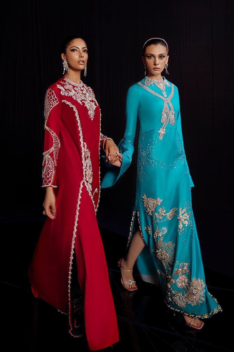 Long shirt in pure raw silk in ruby red color with embroidery in white thread and topped with heavy hand embellishment that includes pearls, Swarovski stones, dabka, 3d pipes, glittery gota pati. It is featured with two front slits in each panel showing off the plain red tailored cut bootcut pants. Focusing much on the details, slits have embellished borders too. Pants are made in pure Thai silk fabric. Sleeves have shiny sequined jaal with pearls outline. Dupatta with/without spray can be added on demand.