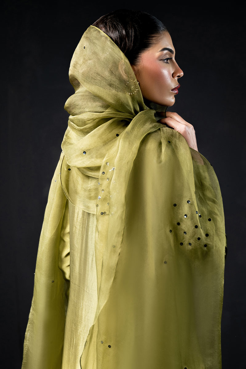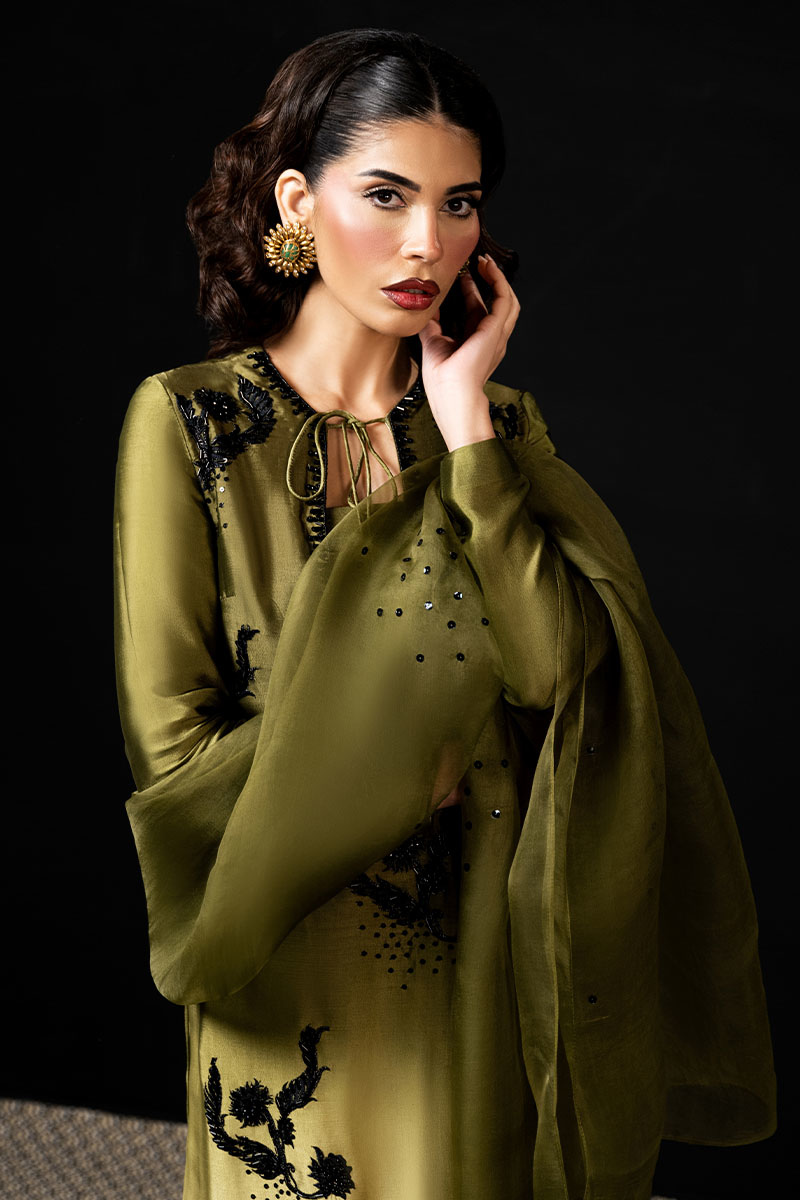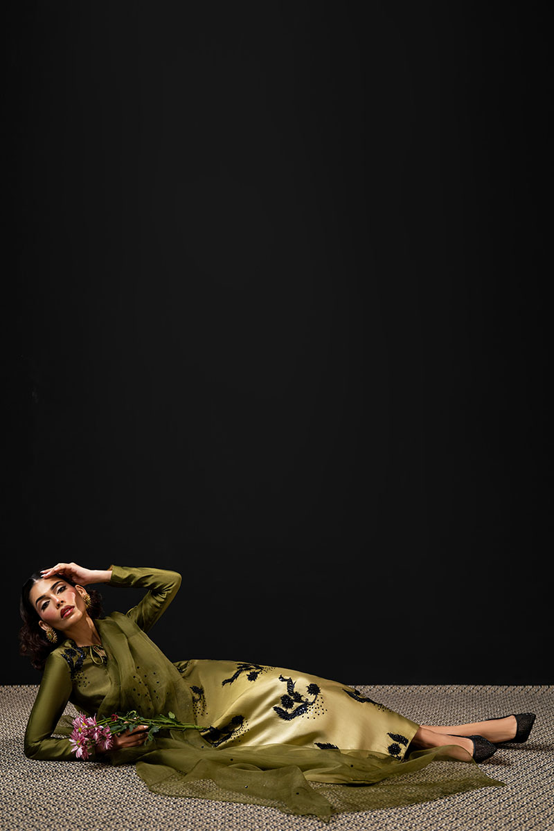 Fabric: Tissue Silk, Thai Silk Color: Olive Work Details: Embroidered and Embellished
