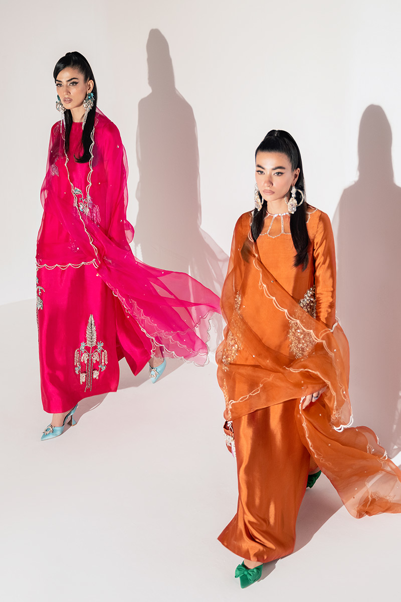 Crafted from the finest quality fabric, this rust orange long and chic Kaftaan shirt with short side slits is a true masterpiece. The silver embellishments add a touch of luxury to the outfit; it has two heavily embellished motifs on the sides with the modern detailed neckline. Perfected with the organza dupatta with a white border adds a touch of sophistication.