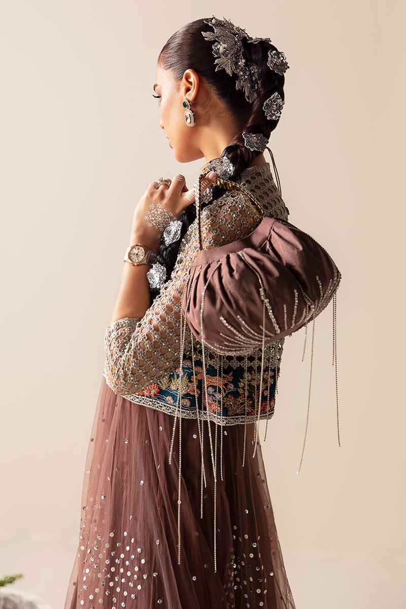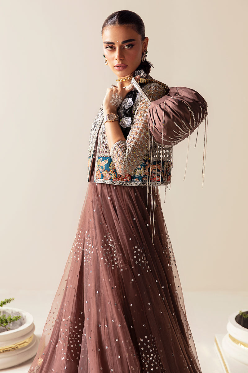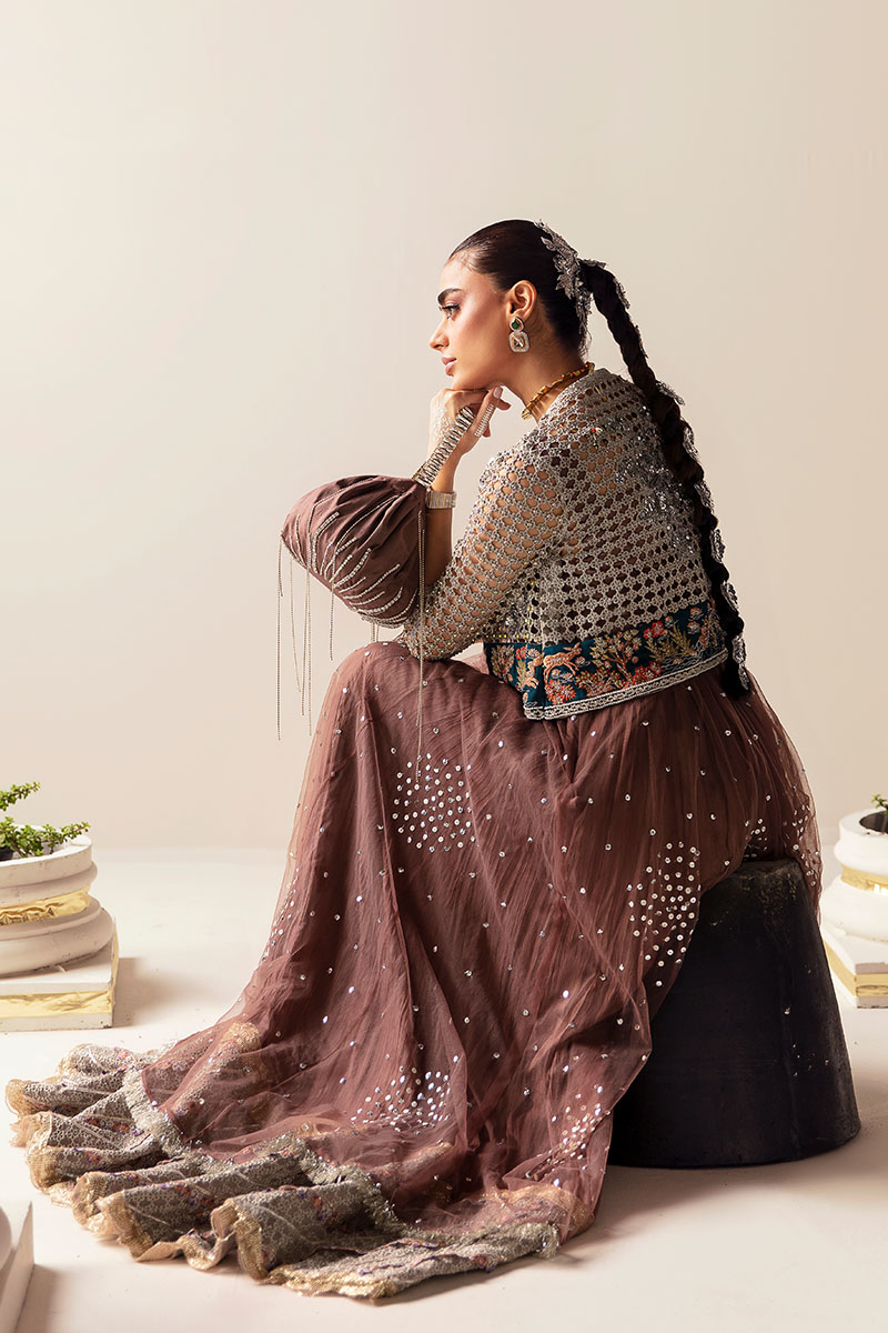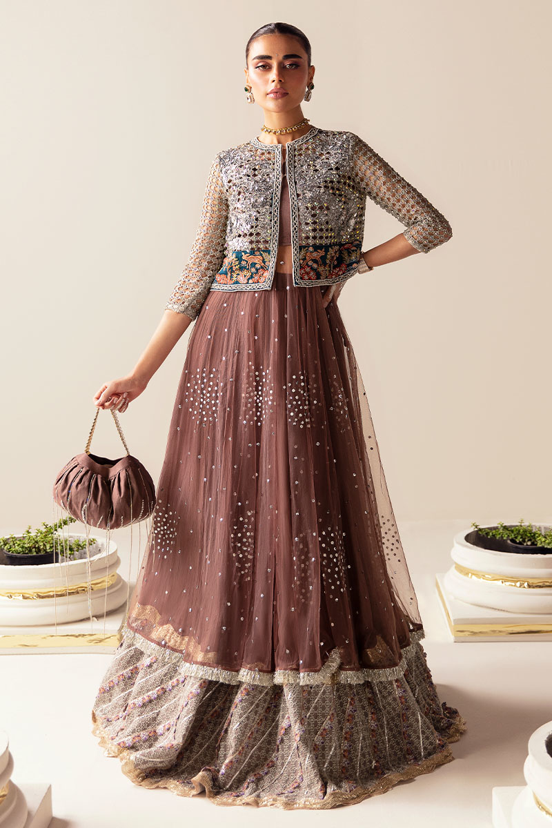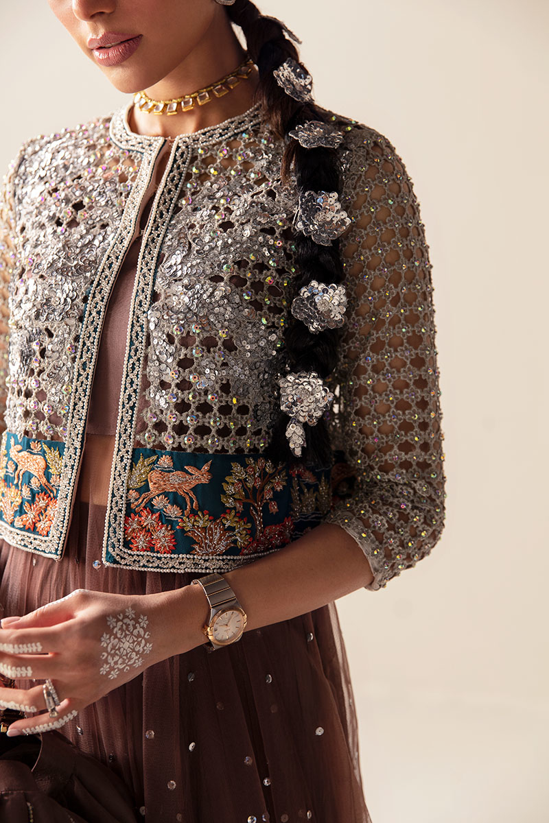 The stunning Nusret ensemble is a dazzling fusion of metallic silver and plum brown. The cropped jacket, Peshwas, and lehnga in this beautiful outfit are all made with the finest craftsmanship and devotion to detail. An abundance of sequins, crystals, and stones are used to create beautiful floral motifs on the front and back of the metallic silver cutwork jacket. It oozes elegance and gives the ensemble a touch of royal splendour with its ornate shikargah border. The Peshwas, which are made of delicate net fabric, are embellished with Swarovski crystals and sequins, giving a stunning look that catches attention from all sides. An embroidered border on the hem of the lehnga, which is made of opulent paper silk fabric. The lehnga's rich flair makes a statement.