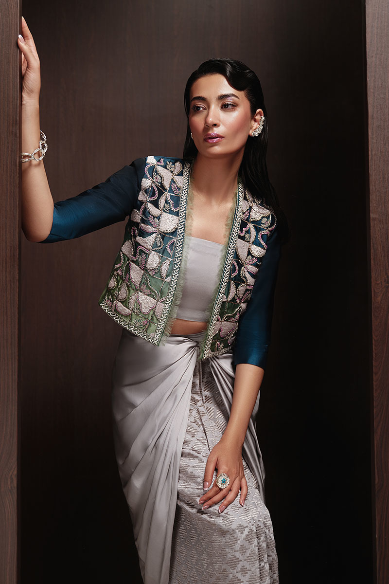 Ombré Sunset, this ensemble exudes elegance with its front-open ombre jacket with a contrast organza neck edging. Complemented by a timeless tube top and a gracefully draped skirt, crafted from luxurious tissue and chimose silk respectively, this ensemble is a masterpiece of sophistication. Each piece is meticulously hand-embellished, ensuring you shine with every step.