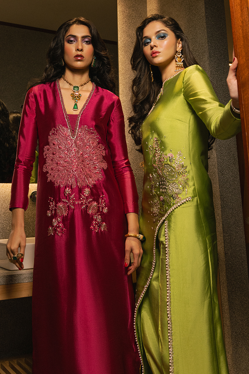 Pop Queen – Where bold elegance meets contemporary finesse. This stunning ensemble features a round-neck asymmetrical shirt, adorned with exquisitely embroidered floral bunches and chunky embellished borders for a striking yet refined look. The straight-fit trouser complements the silhouette perfectly, while the pleated chiffon dupatta, elevated with an embroidered scallop border, adds a touch of graceful movement. Pop Queen is a statement of modern sophistication, perfect for those who dare to shine effortlessly.