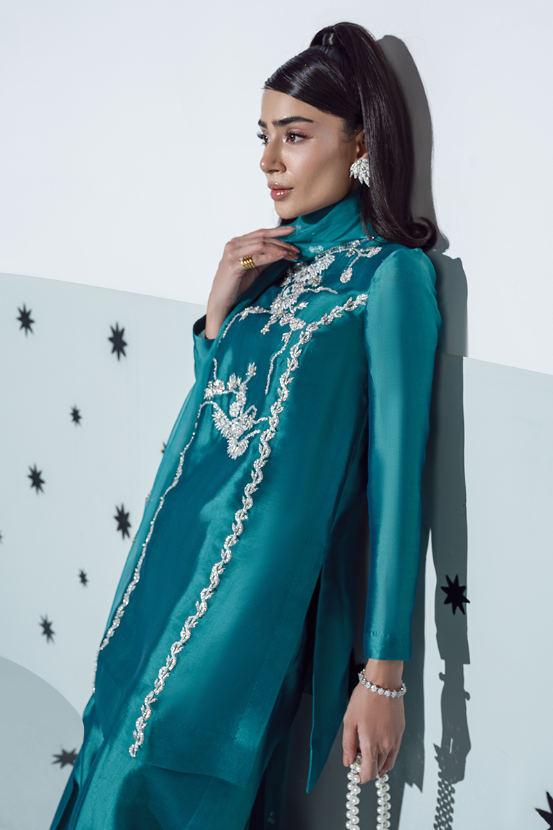 Introducing the 'Pop Star' ensemble in green, a charming and ethereal outfit. Crafted from organza and tissue silk, it delicately drapes your silhouette. The beautifully embroidered shirt features handcrafted embellishments for a touch of luxury. Paired with flowing palazzo pants, it exudes regal elegance and unparalleled style. Perfect for making a captivating fashion statement at any special occasion.