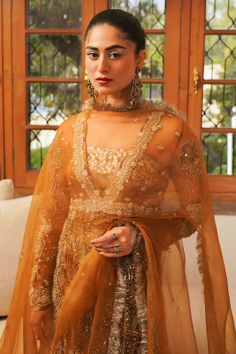 Step into the world of elegance with 'Zafraan,' a captivating formal ensemble in the enchanting shade of dull mustard yellow. This all-inclusive set includes a fully hand-embellished shirt, resplendent with nakshi dabka, resham thread, and shiny stones, exuding luxury. The bodice cut shirt, crafted in net, boasts long side slits and a scalloped border for an elegant and contemporary silhouette. Complementing this is a pair of shiny badal zari organza flared trousers. The ensemble is completed with an organza dupatta featuring a chan and kiran lace border, adding a touch of sophistication. Zafraan seamlessly blends traditional charm with modern embellishments, making a lasting statement.