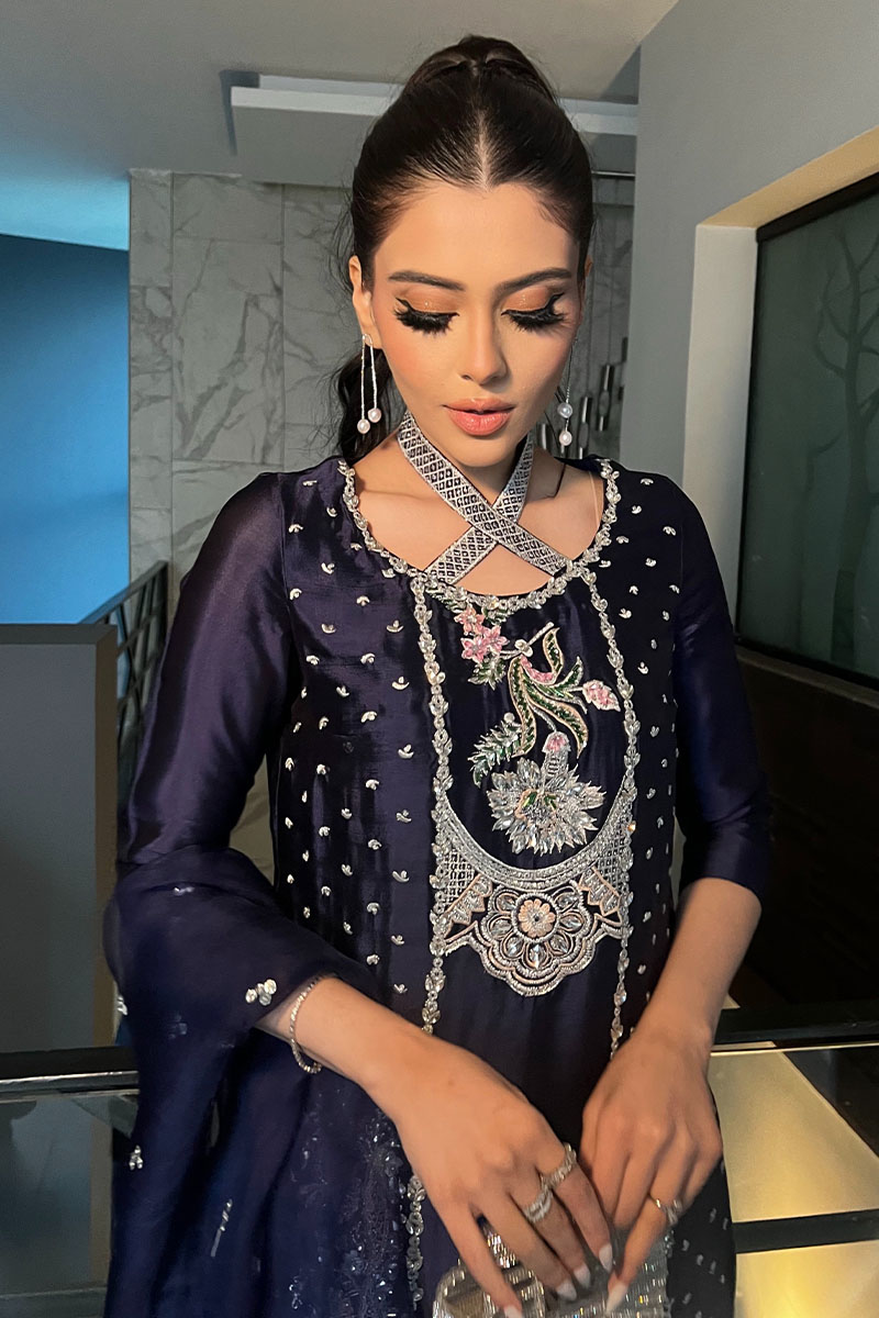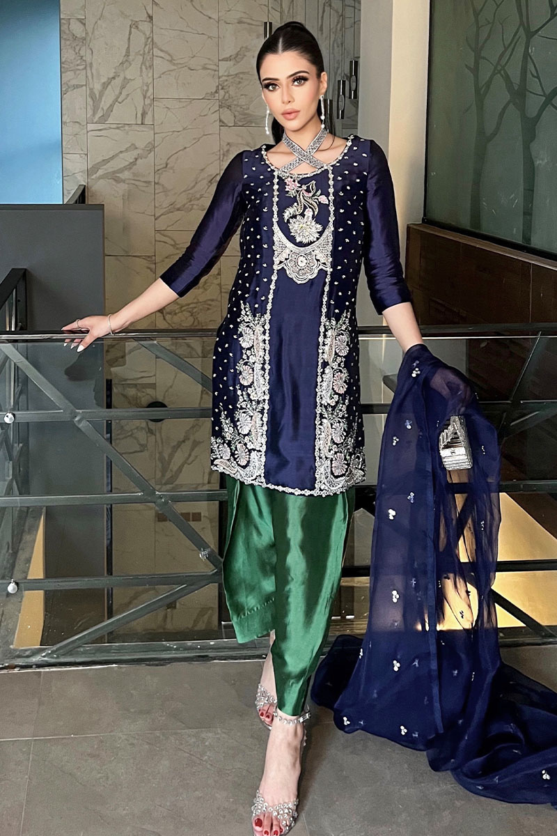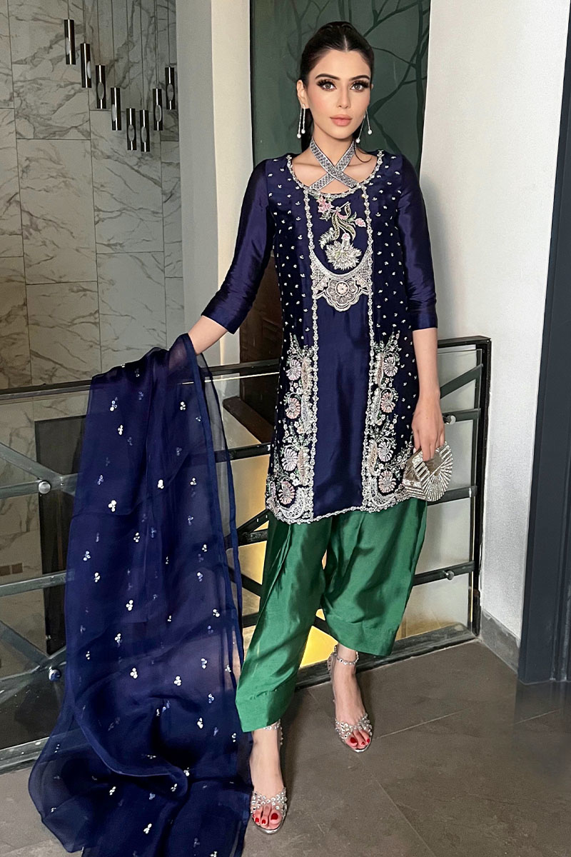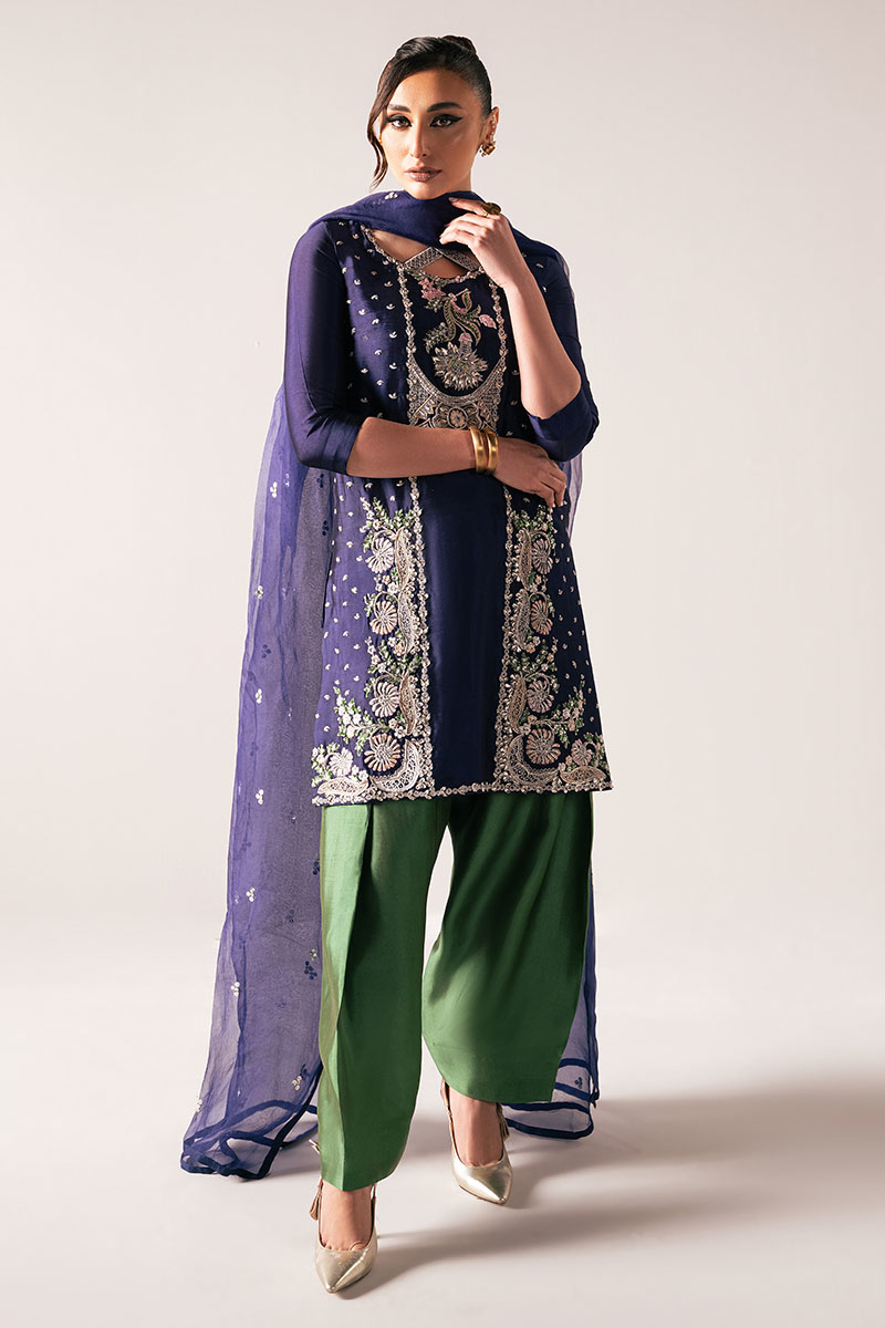 "Manto": a regal ensemble crafted from luxurious tissue silk. Adorned with intricate embellishments, the short shirt features a round neckline and three-quarter fitted sleeves, exuding timeless elegance. Paired with a pleated shalwar in rich green and complemented by an organza heavy sequins spray dupatta, "Manto" embodies sophistication and grace, making it a true statement.
