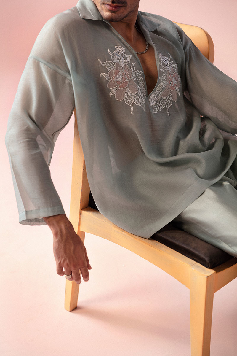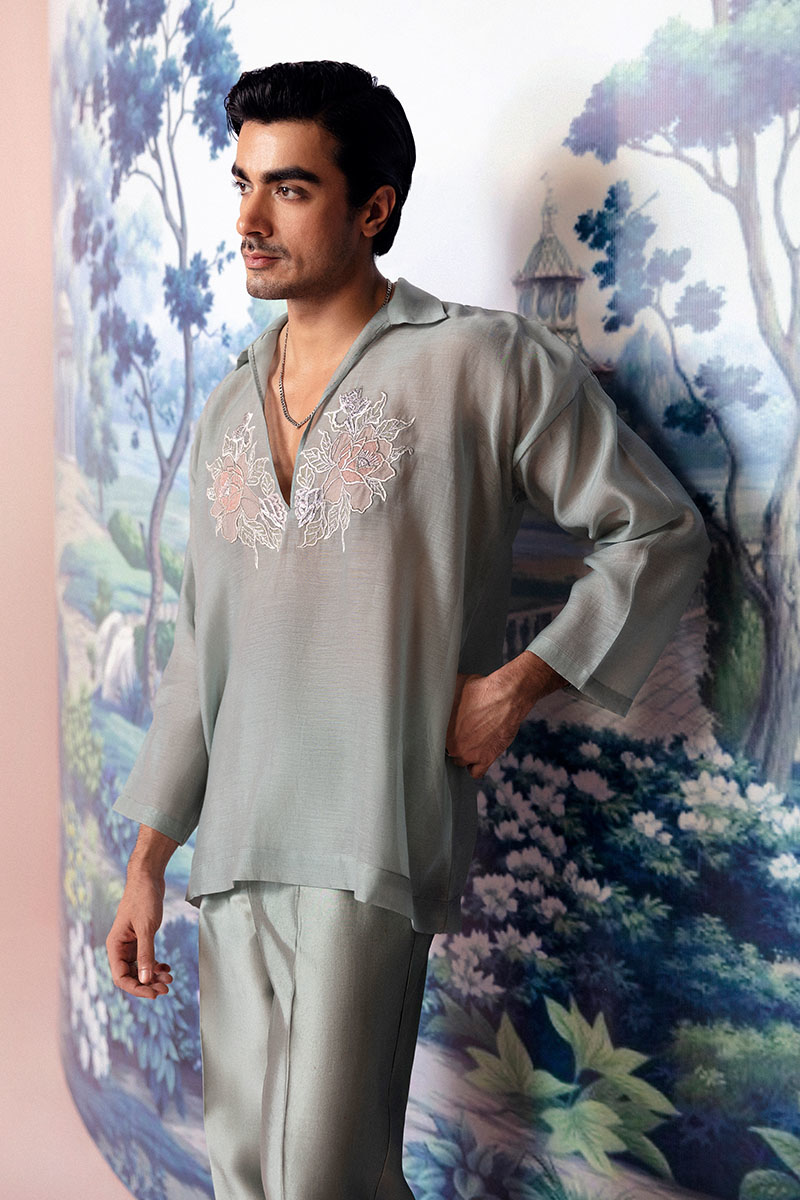 A charming dull sage green outfit. The paper silk shirt boasts a deep V-neck with collar detail and exquisite patchwork, while the relaxed fit trouser ensures comfort making it an embodiment of sheer elegance and style.