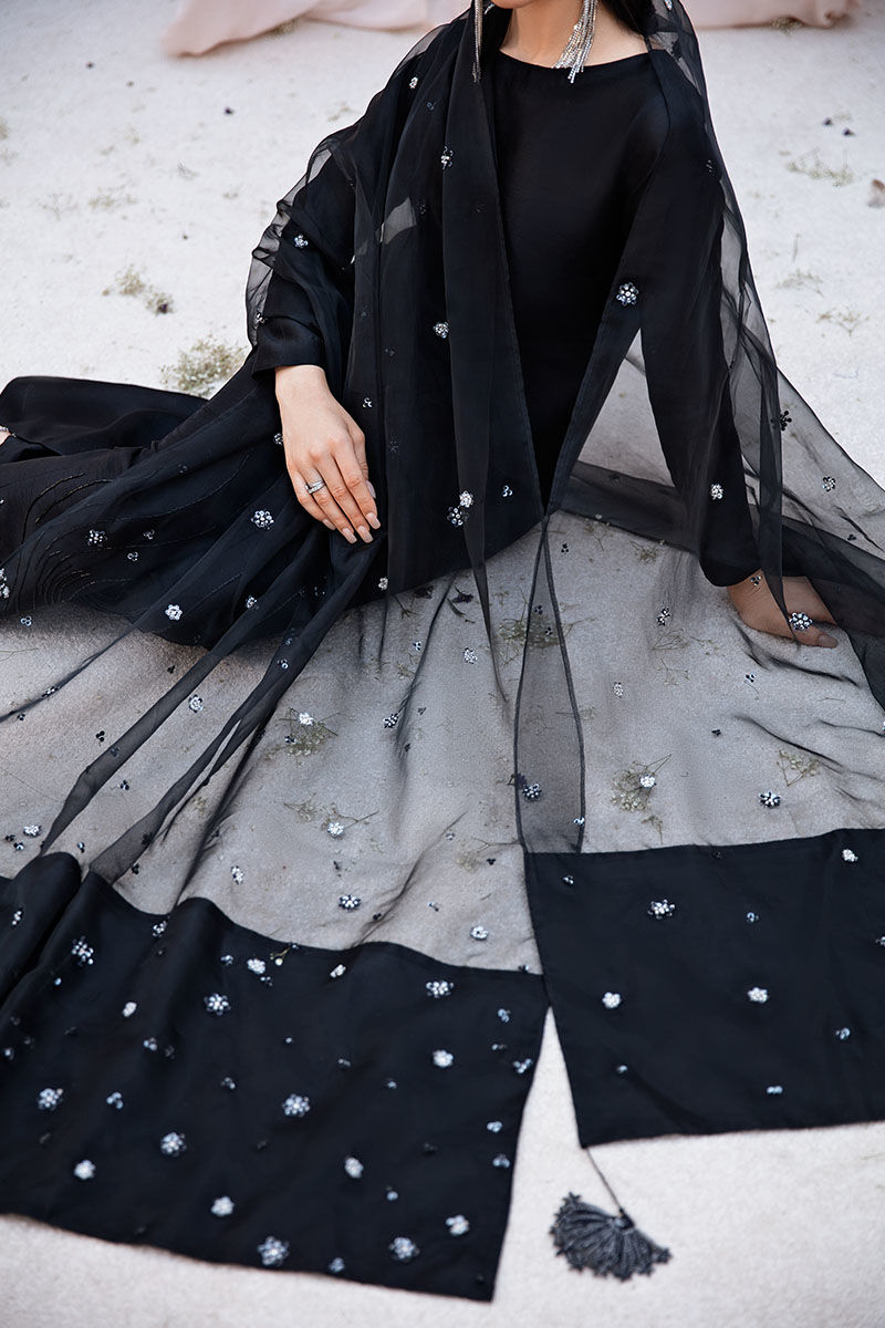 Fabric: Pure Tissue Silk Color: Black Work Details: Embellished
