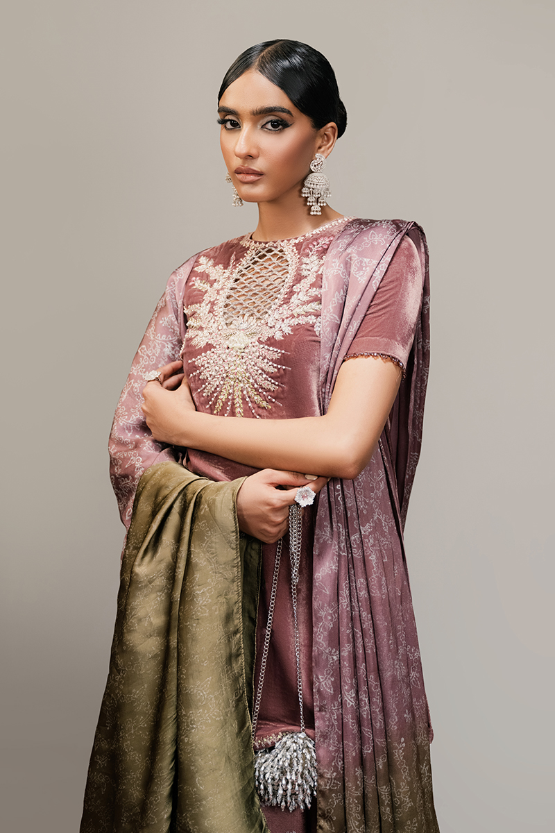 A Sangria-hued masterpiece blending elegance with exquisite detail. This velvet short shirt and Thai silk Sharara duo shines with naqshi, beadwork, and Swarovskis, while cutwork, a criss-cross back, and waist-high slits add charm. Paired with an ombré Chimose silk dupatta, Seductress is crafted to captivate.