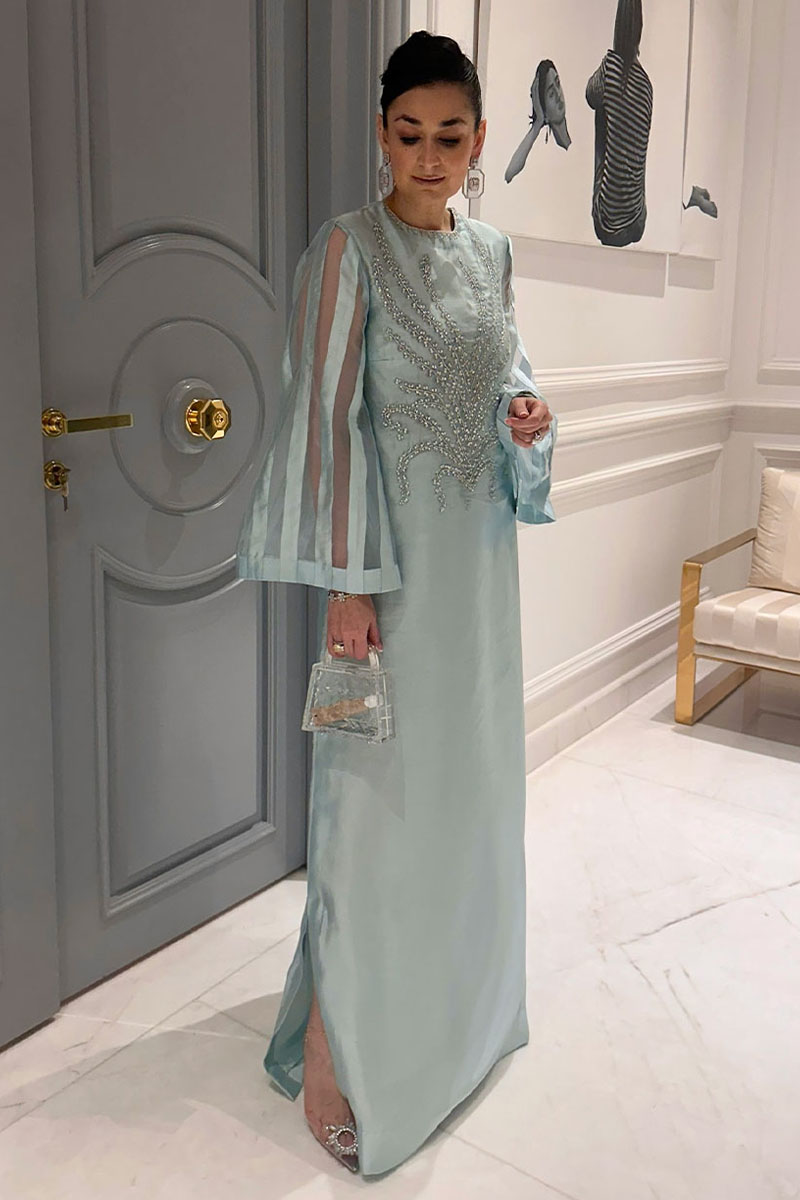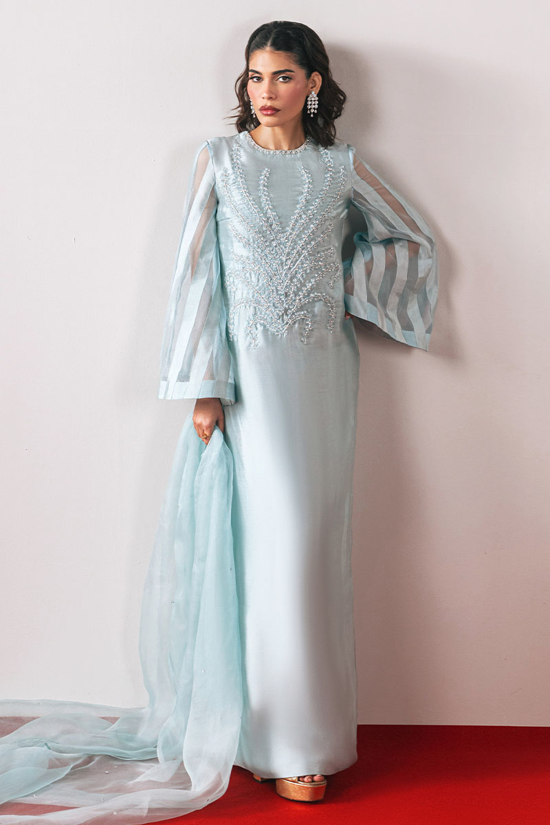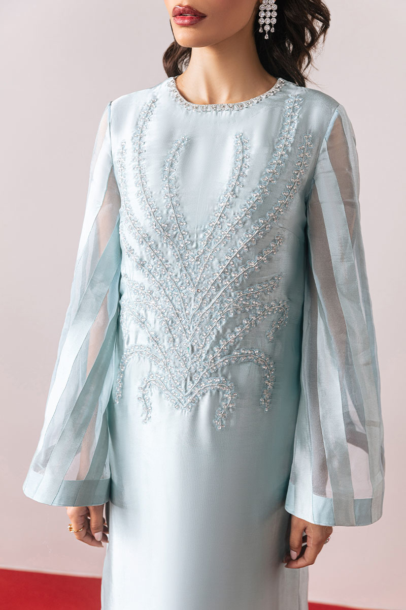 Behold the "Queen of the Sky" ensemble, a mesmerizing portrayal of elegance and grace, fashioned from sumptuous tissue silk in a captivating sky-blue hue. This ensemble features a long shirt adorned with intricately embellished neckline design and side slits, offering a modern twist. Paired with dazzling organza sequins spray dupatta and cigarette trousers, this ensemble exudes regal charm and sophistication, promising to leave a lasting impression wherever you go.