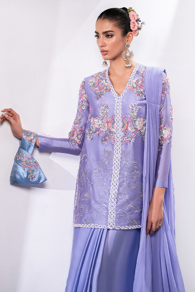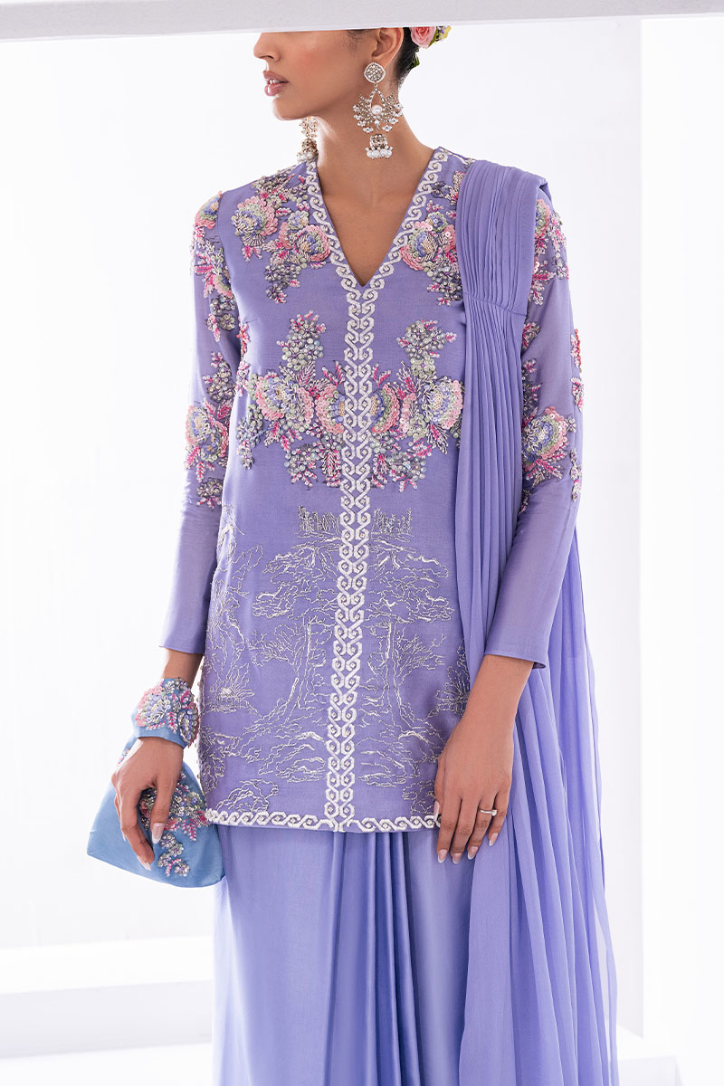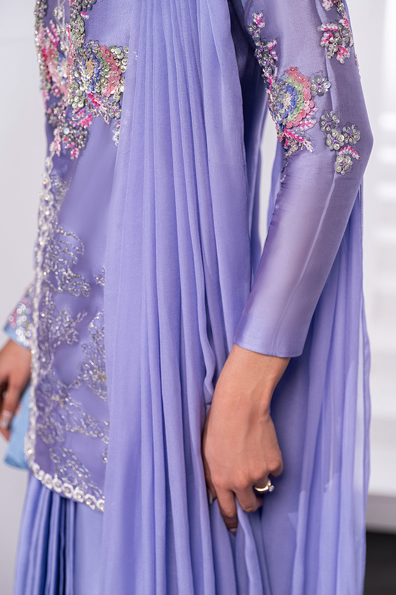 Fabric: Shirt: Tissue Silk, Skirt: Chimose Silk Color: Lavender Work Details: Embroidered and Embellished