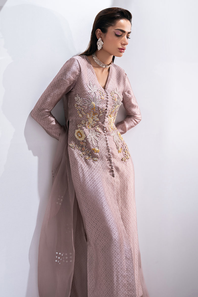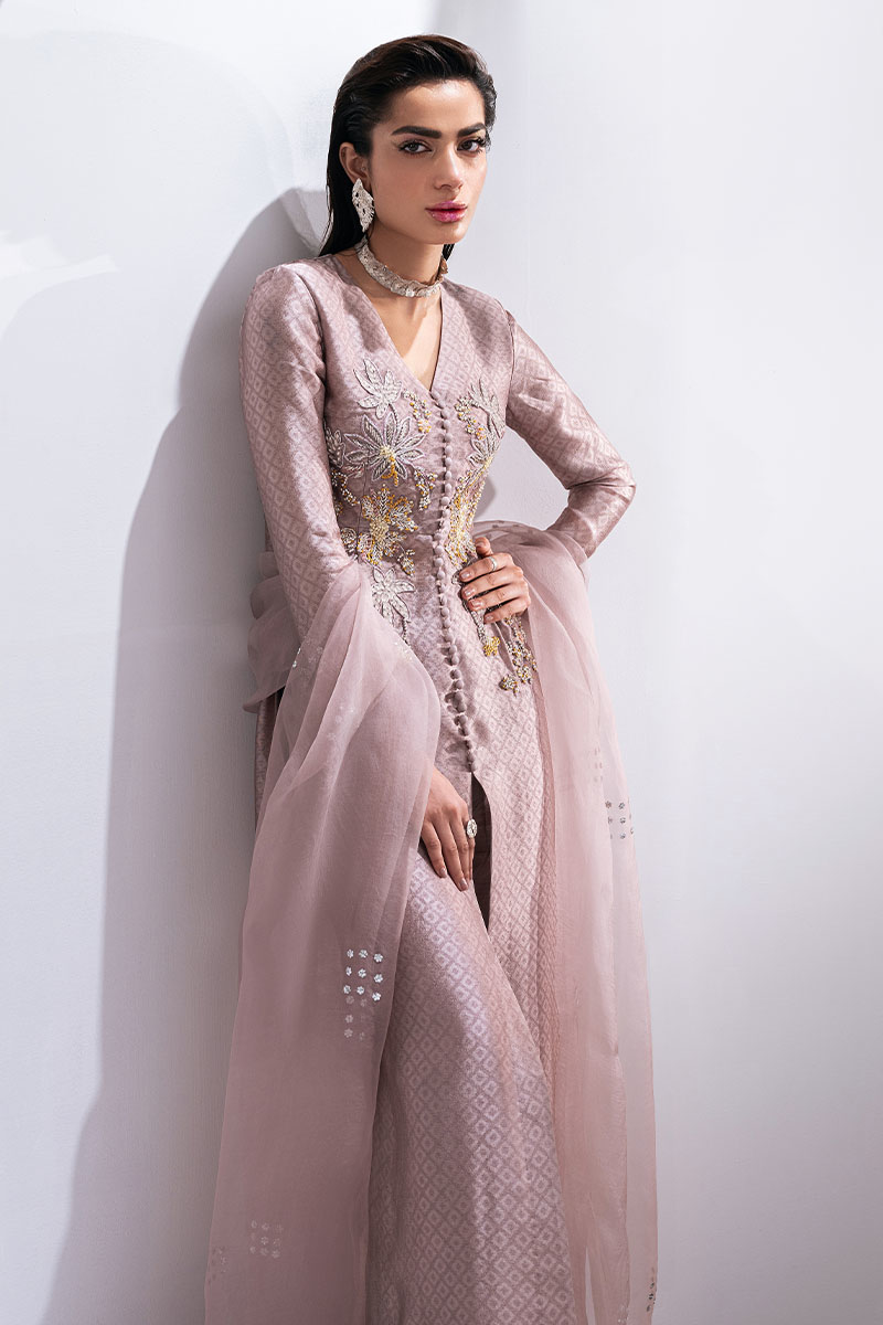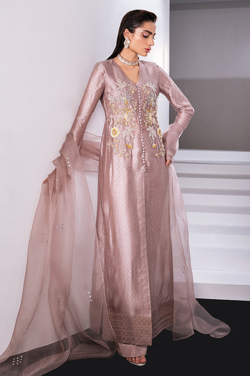 Presenting Spinfluence in Dusty Pink – an epitome of sophistication and grace. This exquisite ensemble is meticulously crafted to adorn you with timeless elegance and undeniable charm. A stunning V-neck dress with a waist-high slit, adorned with a crisscross organza border and intricate button detailing. Hand-embroidered motifs add exquisite charm. Paired with boot-cut trousers in luxurious Thai Silk and an embellished organza dupatta.