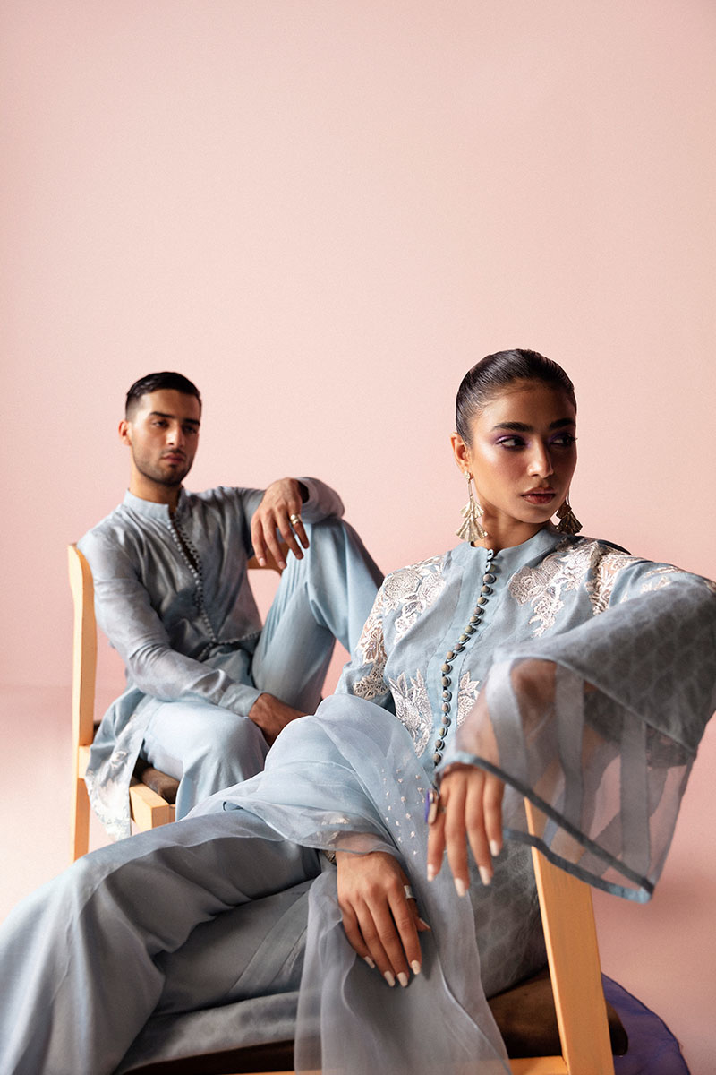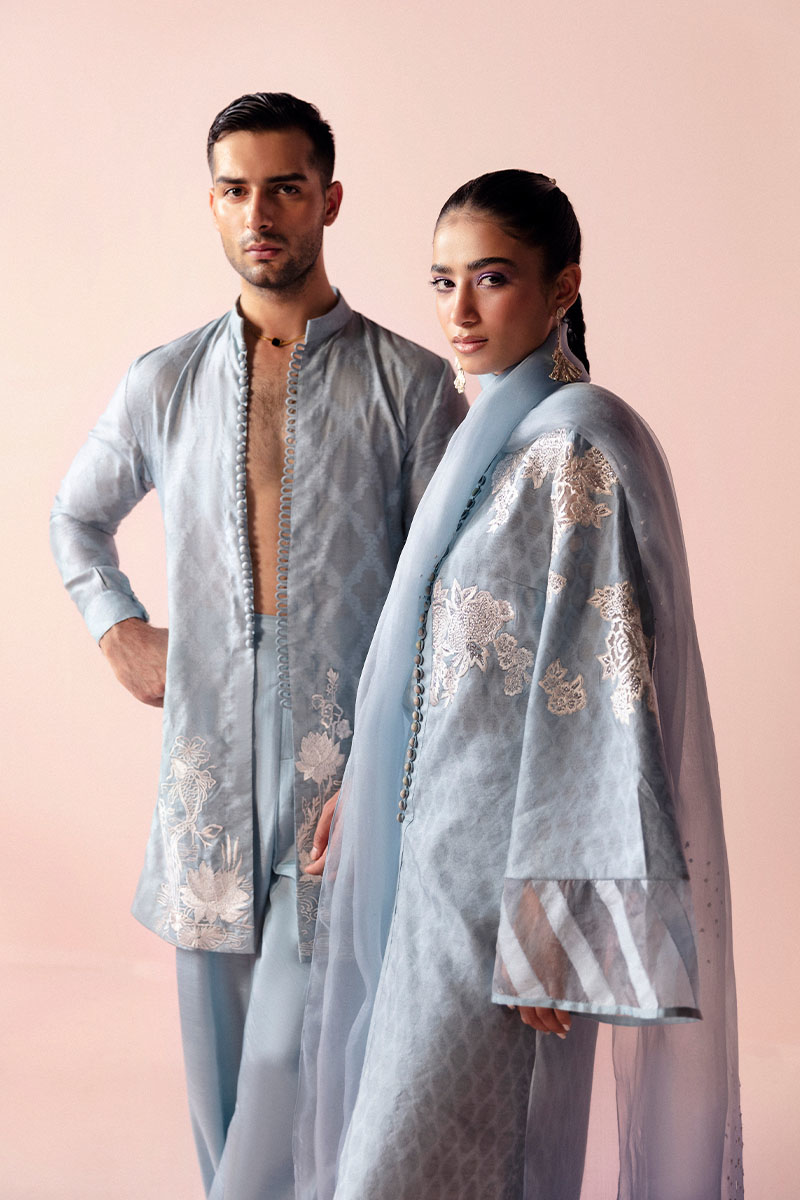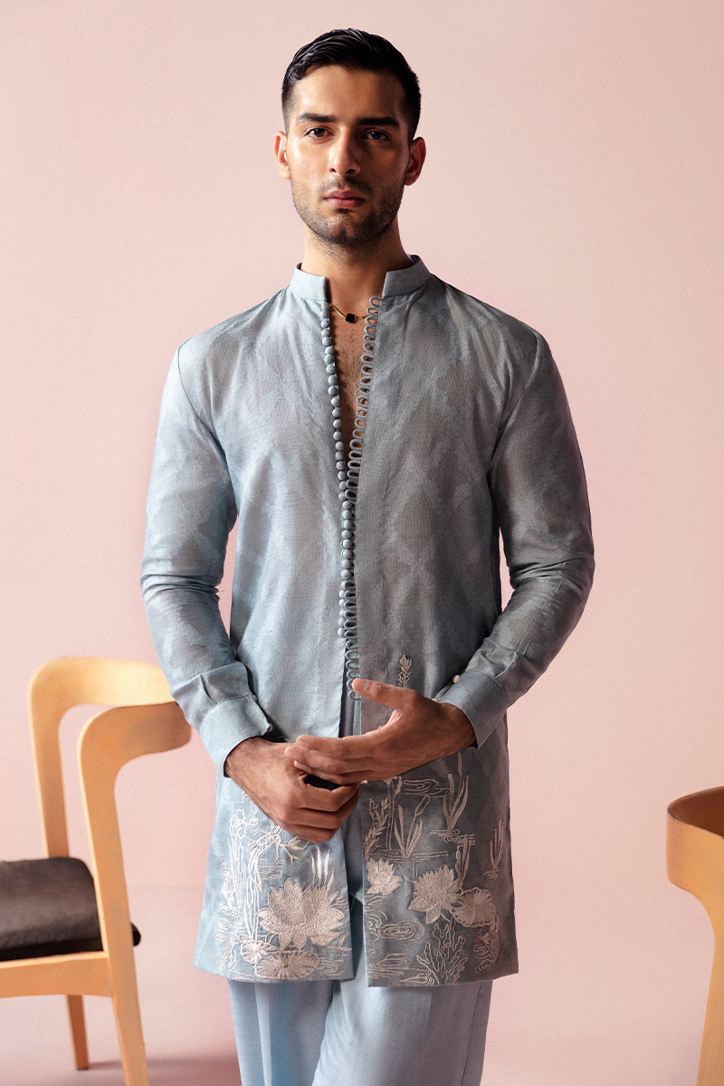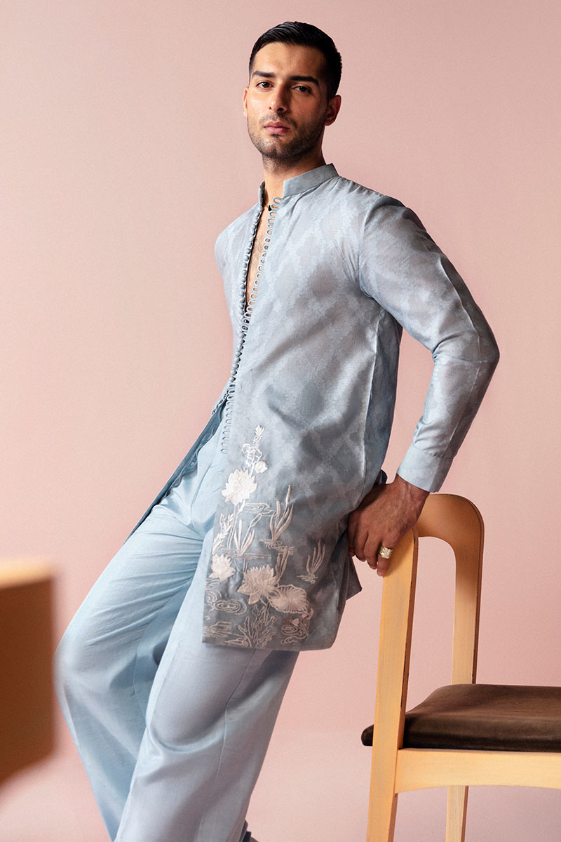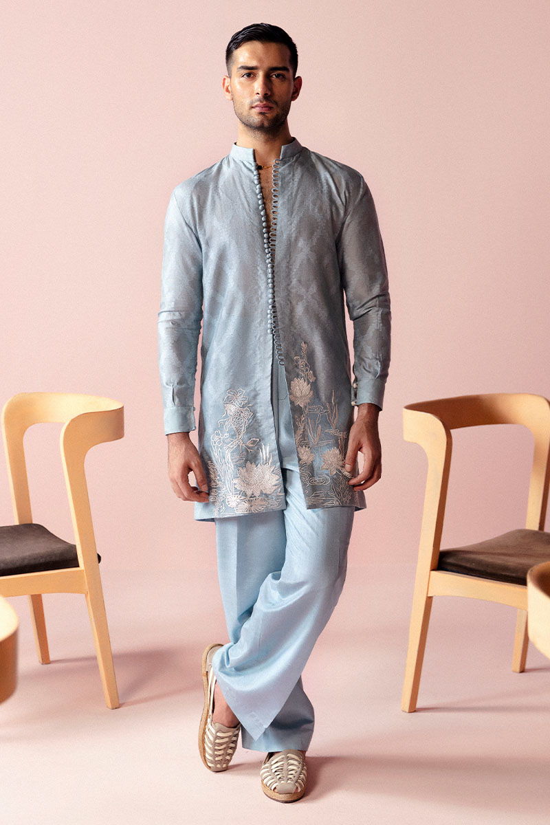 This powder blue sherwani-style kurta, crafted from textured cotton net, features intricate machine-embroidered marine life detailing. Paired with relaxed fit trousers, this outfit combines tradition and modern elegance effortlessly. Perfect for making a statement at any event.