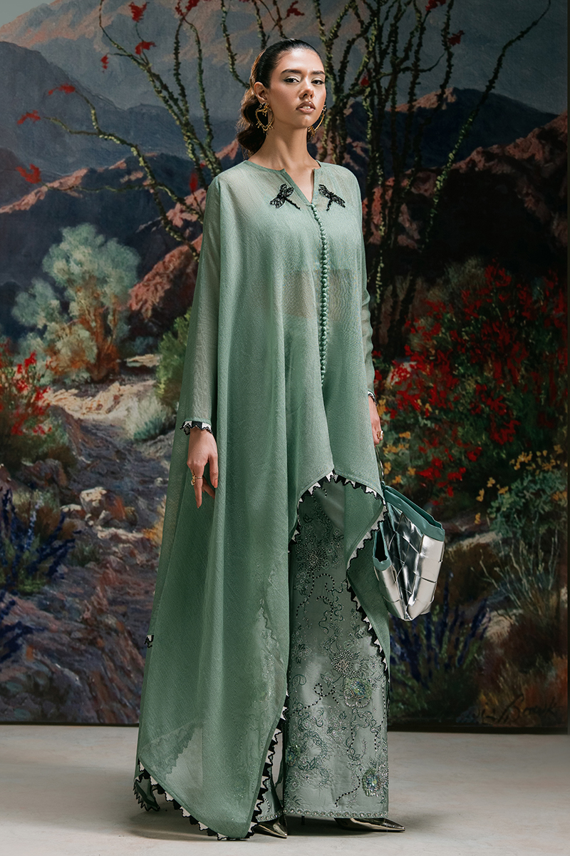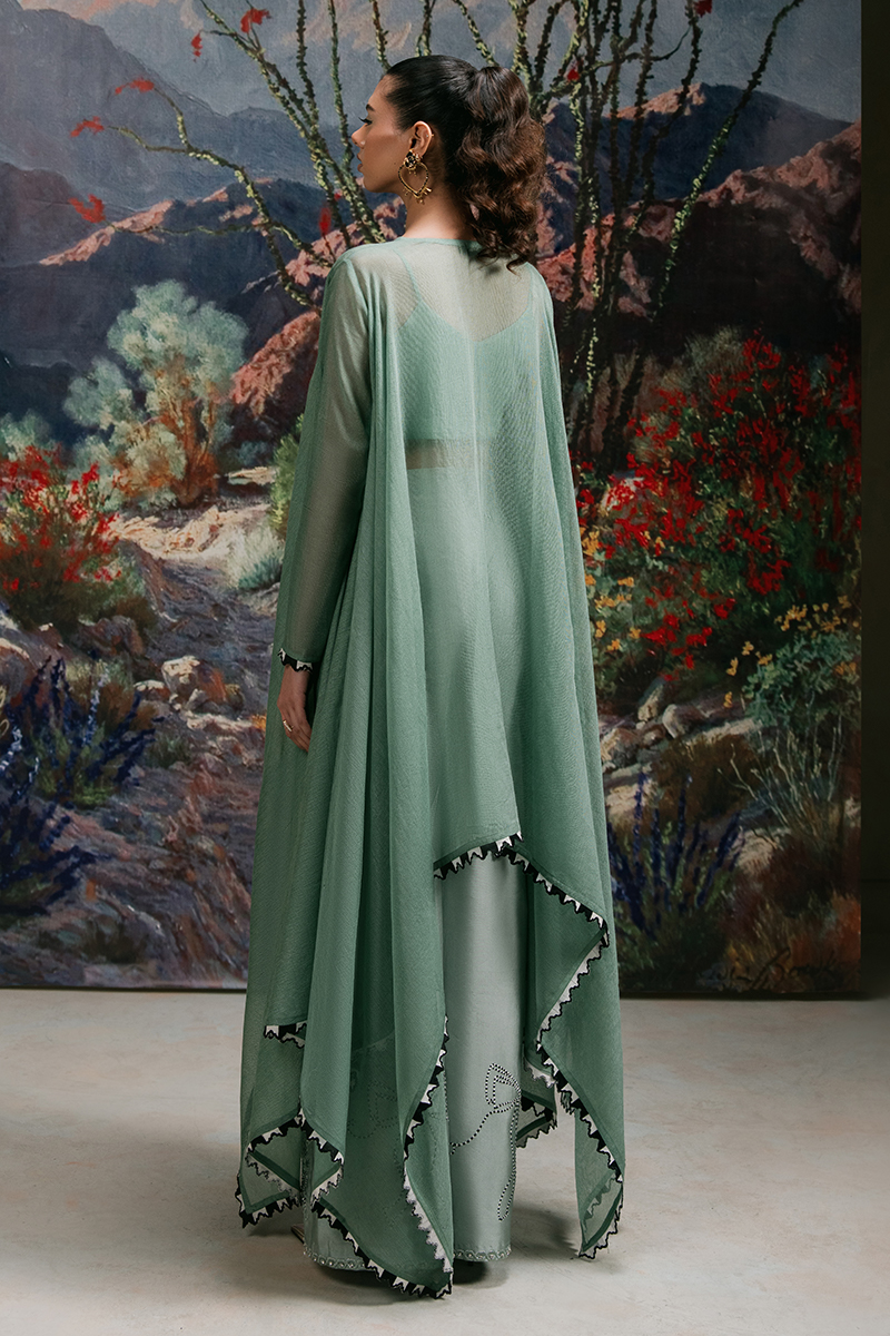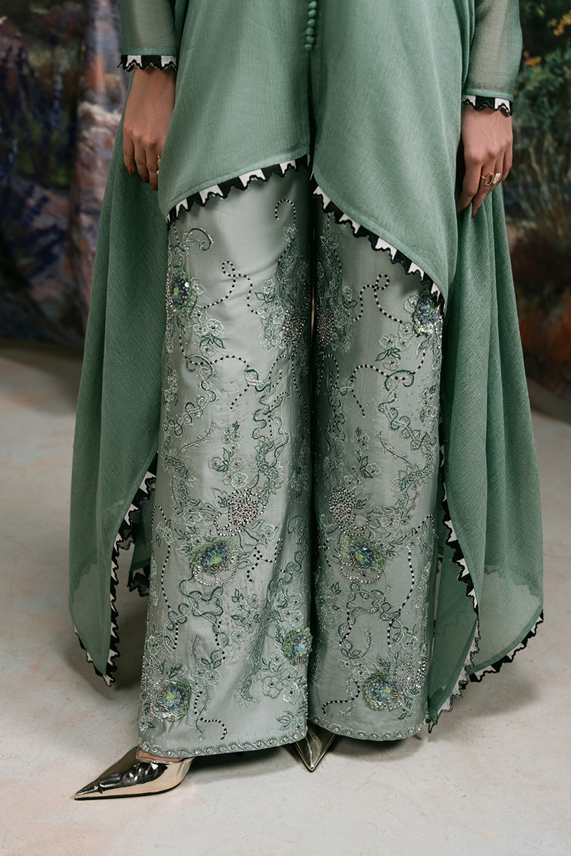 Fabric: Kaftaan: Cotton Net, Trousers: Thai Silk Color: Jade Green Work Details: Embroidered and Embellished
