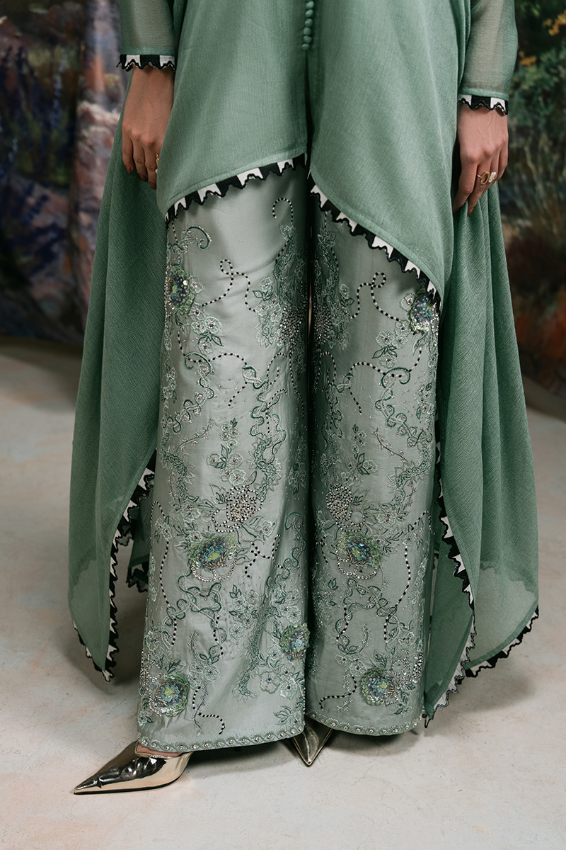 Starstruck - A Vision of Effortless Elegance. Drape yourself in the allure of Jade Green with Starstruck, a masterpiece of refined craftsmanship. This cotton net kaftan, adorned with a delicately embellished dragonfly motif, exudes effortless charm. The design is elevated with a scalloped embroidered border and intricate button detailing on the front, adding a touch of sophistication. Paired with a straight-fit Thai silk trouser, exquisitely embroidered and hand-embellished with cut dana, crystals, pearls, and sequins, this ensemble is a statement of modern elegance and timeless beauty.