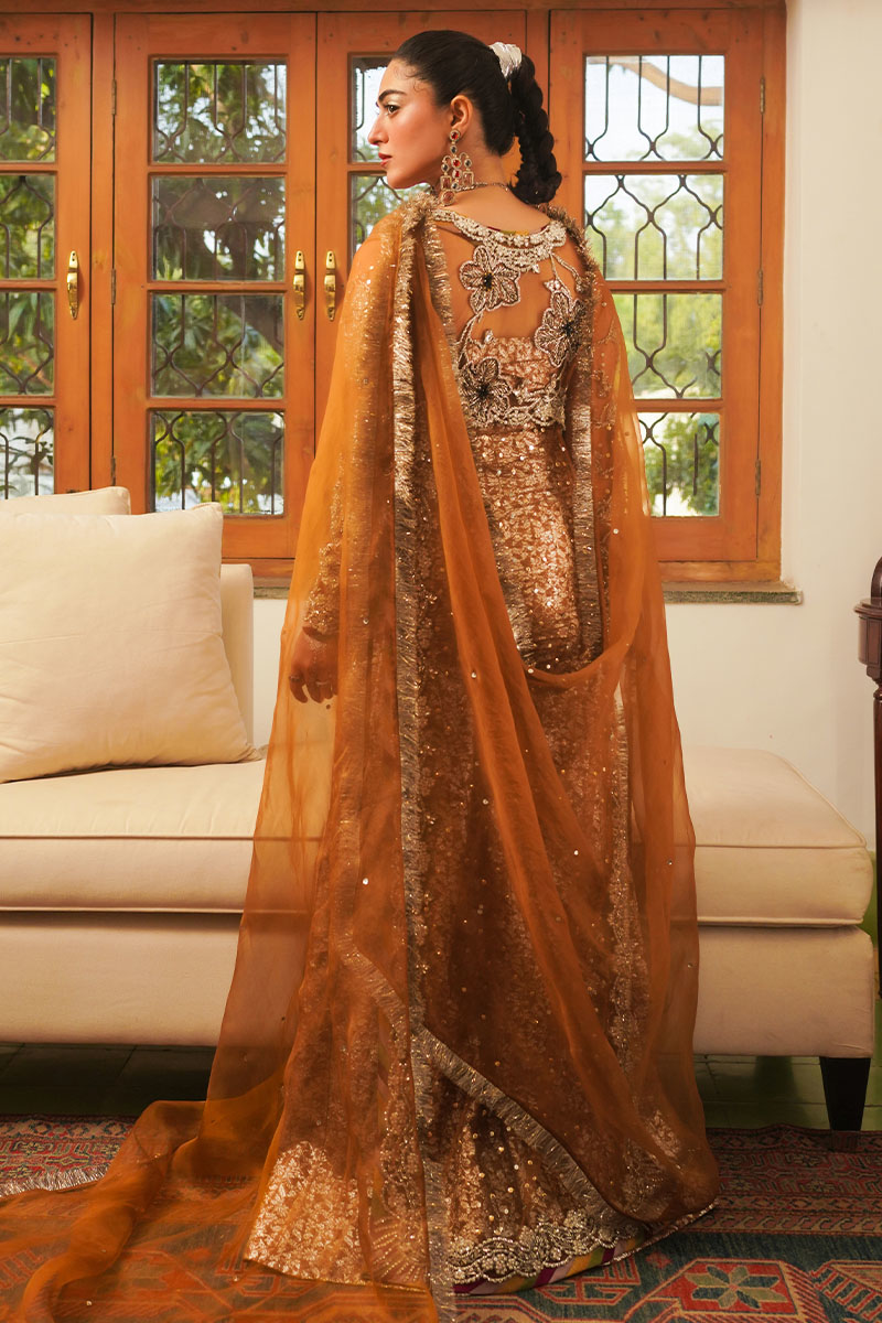 Step into the world of elegance with 'Zafraan,' a captivating formal ensemble in the enchanting shade of dull mustard yellow. This all-inclusive set includes a fully hand-embellished shirt, resplendent with nakshi dabka, resham thread, and shiny stones, exuding luxury. The bodice cut shirt, crafted in net, boasts long side slits and a scalloped border for an elegant and contemporary silhouette. Complementing this is a pair of shiny badal zari organza flared trousers. The ensemble is completed with an organza dupatta featuring a chan and kiran lace border, adding a touch of sophistication. Zafraan seamlessly blends traditional charm with modern embellishments, making a lasting statement.