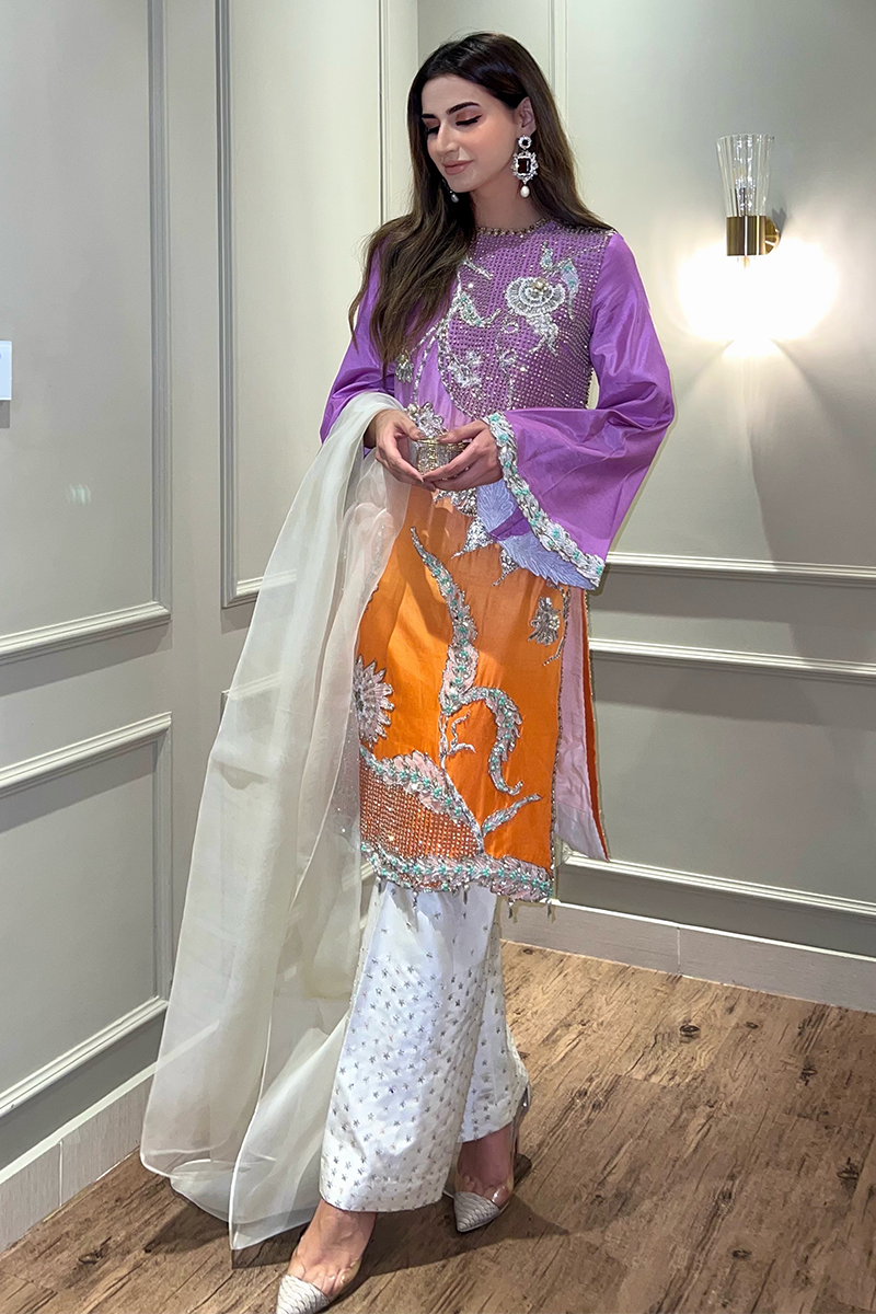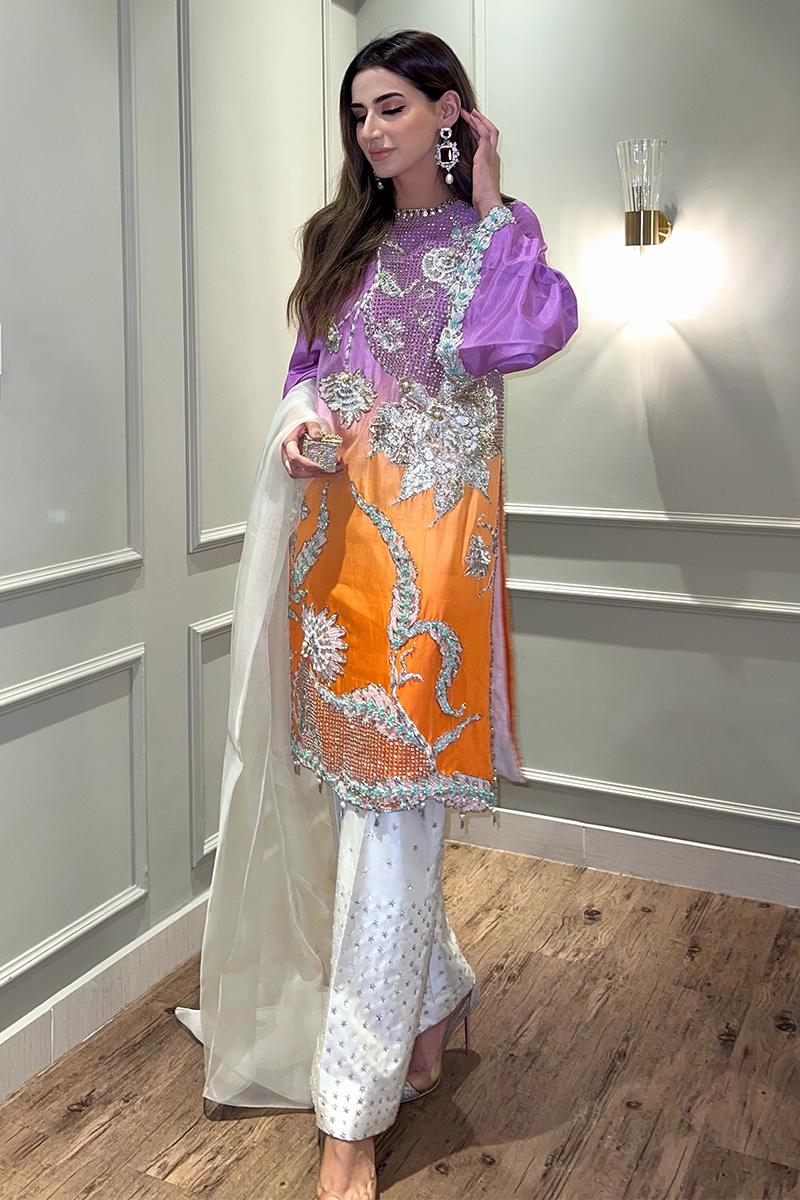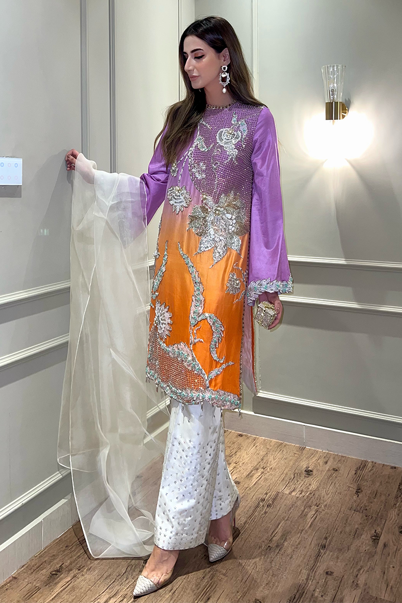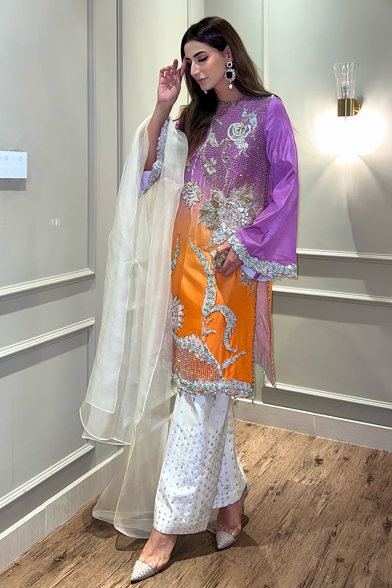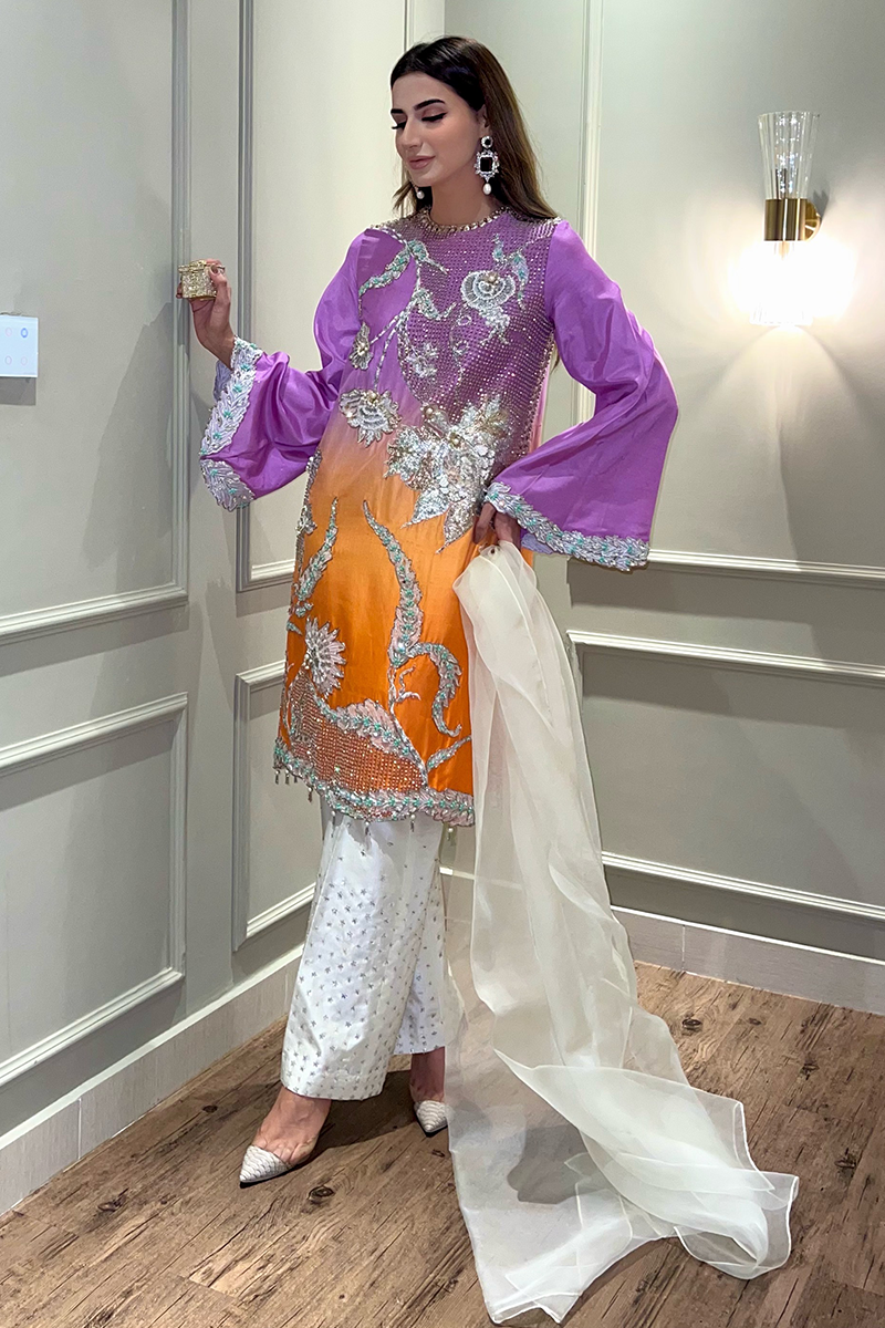 Fabric: Raw Silk Color: Ombre of Lilac and Orange Work Details: Embellished
