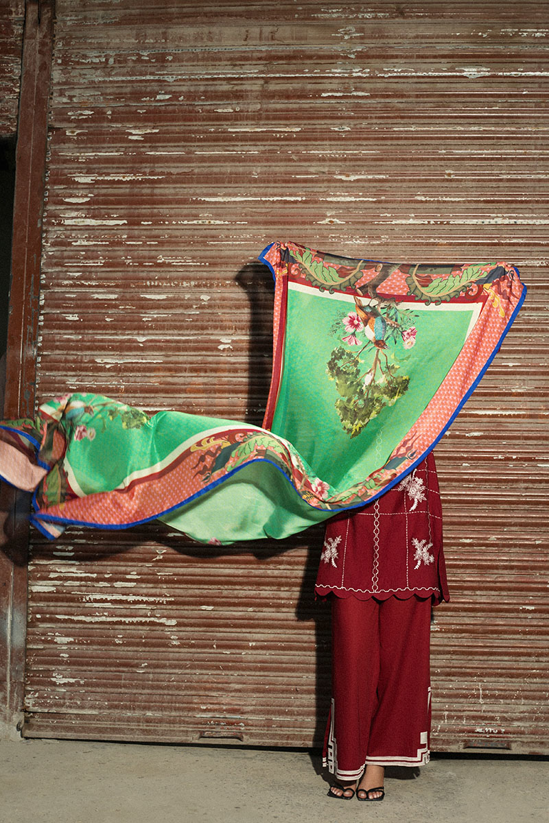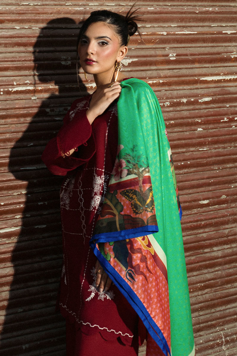 Description: Elevate your wardrobe with this 3-piece red ensemble featuring an embroidered lawn cotton shirt, matching trousers with geometric motifs, and a printed silk dupatta. Stylish details like a V-neck, scalloped hemline, and lace-trimmed cuffs add timeless charm to this elegant outfit.