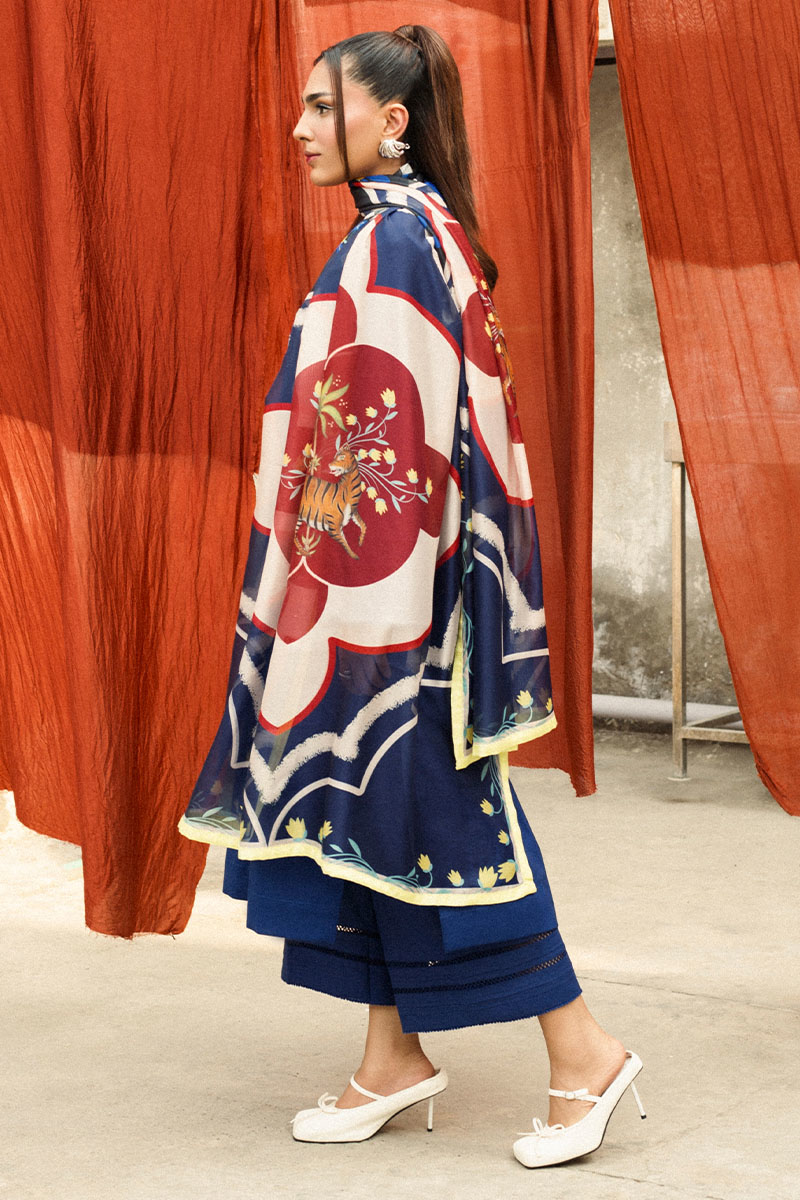 Description: Make a statement in this 3-piece ink blue ensemble featuring a lawn cotton V-neck shirt with embroidered motifs, lace detailing, and flared sleeves. Paired with culottes and a printed silk dupatta with contrast edging, it's the perfect blend of elegance and ease.