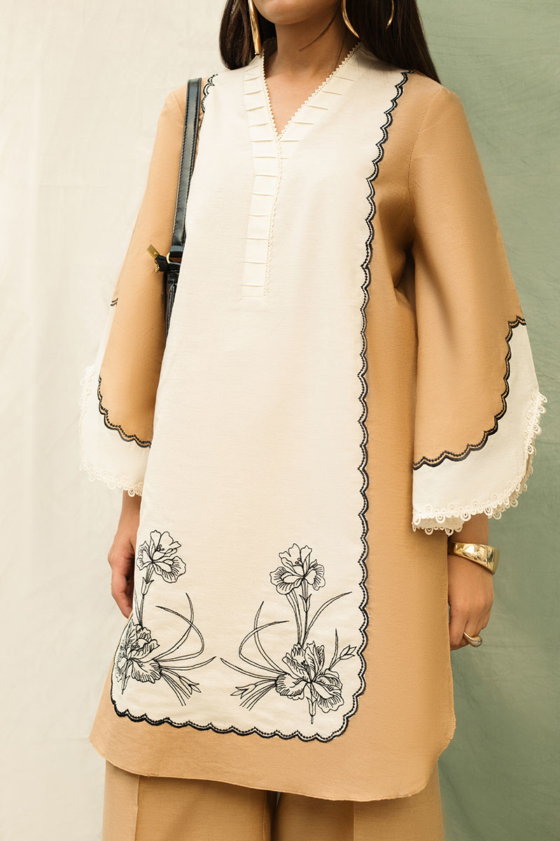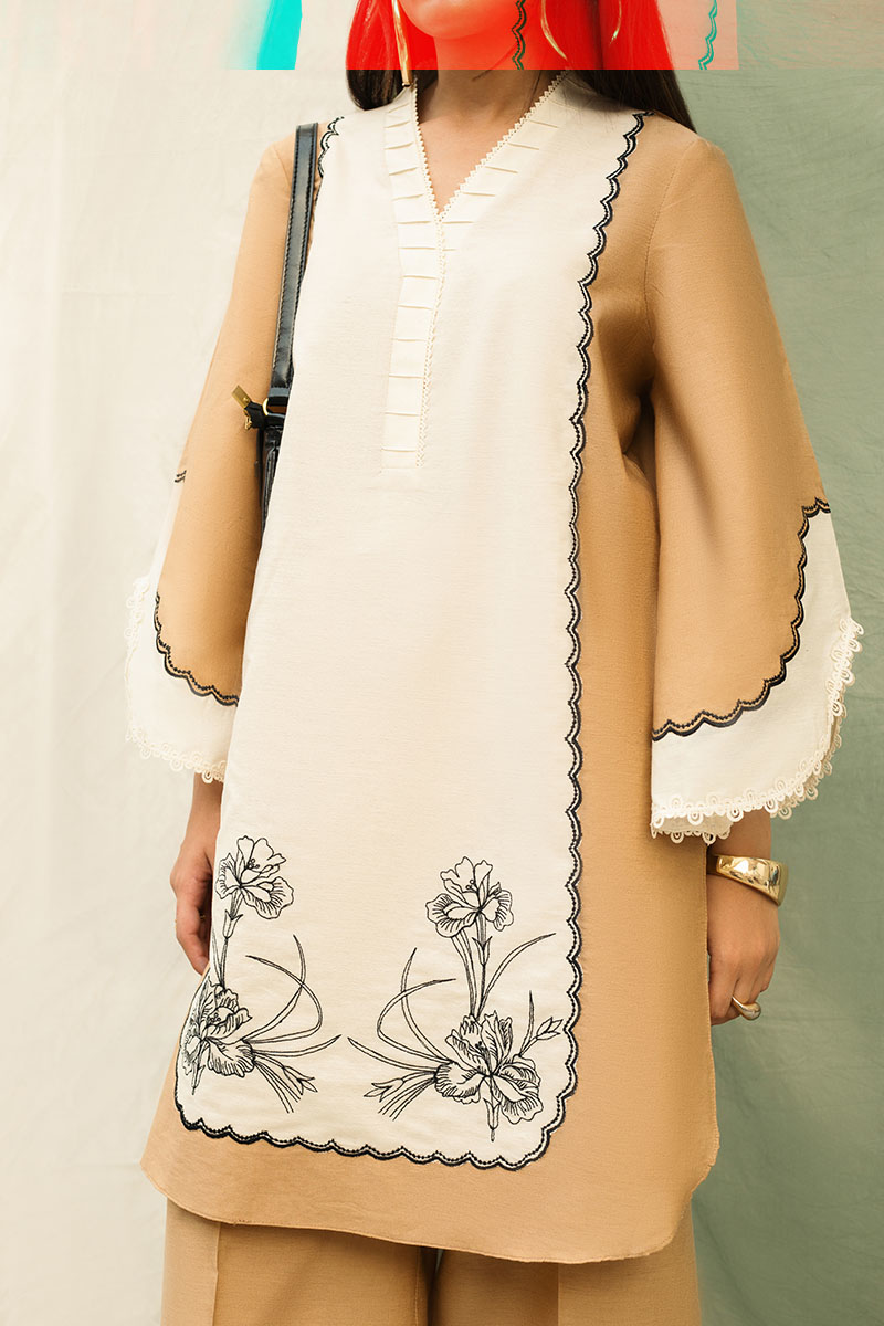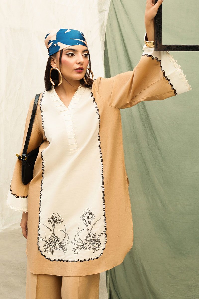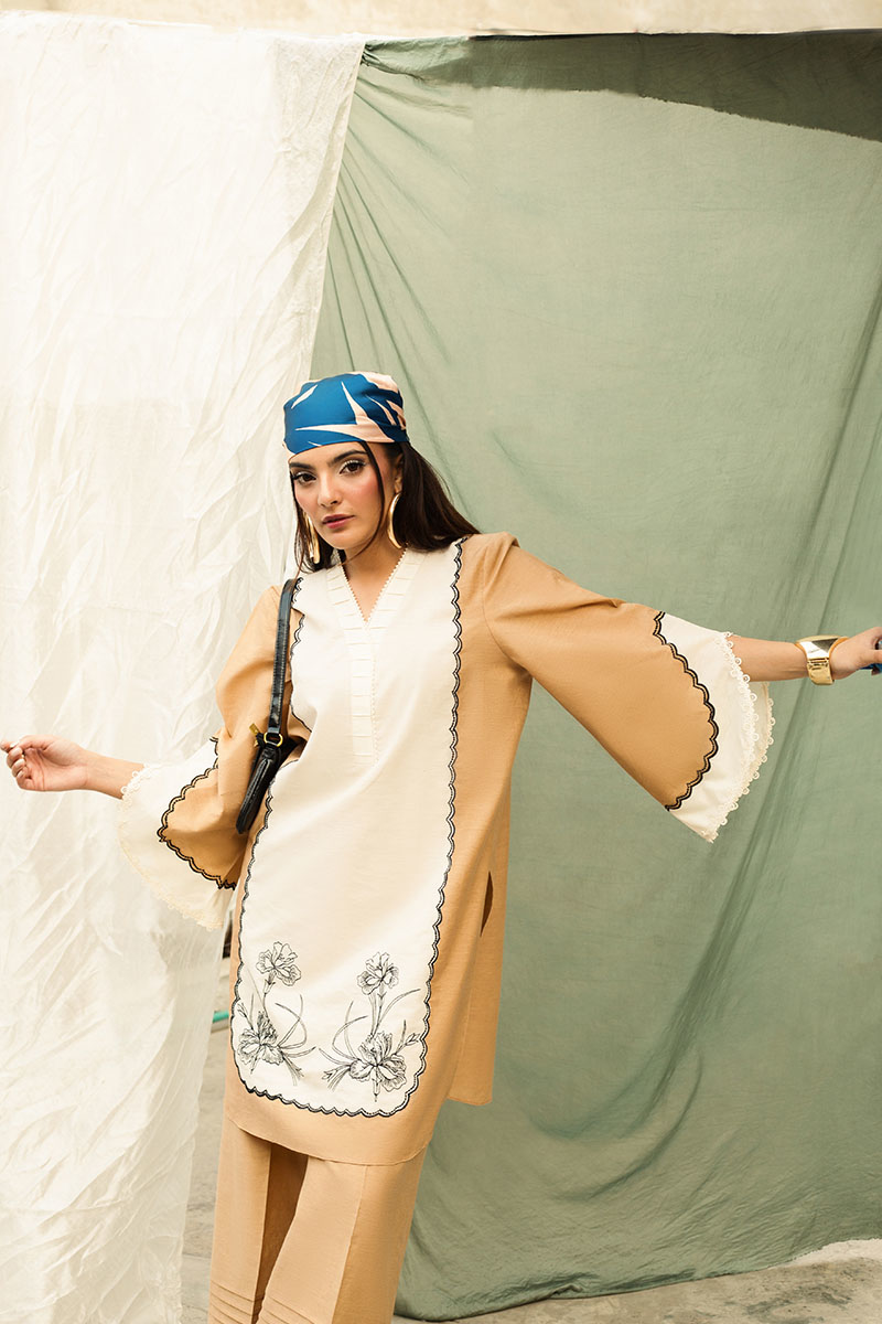 Description: Chic and understated, this 2-piece beige and white cambric set features a knee-length shirt adorned with floral embroidery, patchwork, and lace inserts. Paired with pleated culottes, it's a graceful everyday look with refined detailing.