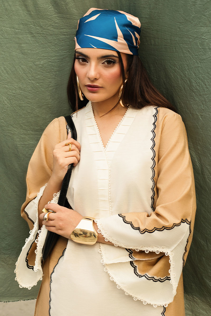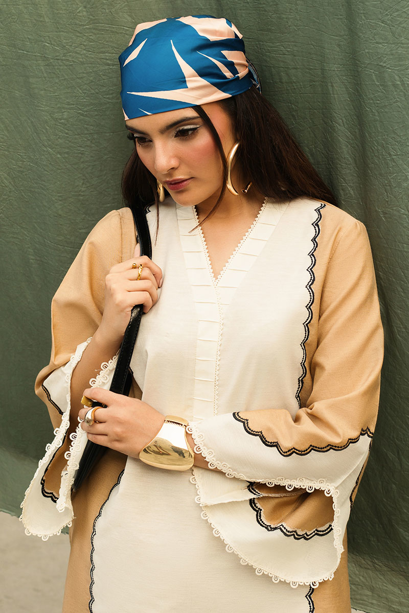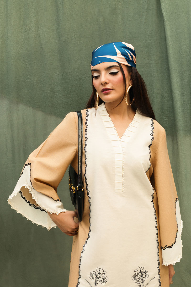 Fabric: Shirt (Cambric) / Trouser (Cambric) / Dupatta (Chimose silk) Color: Beige and White Work Details: ⁠Embroidered